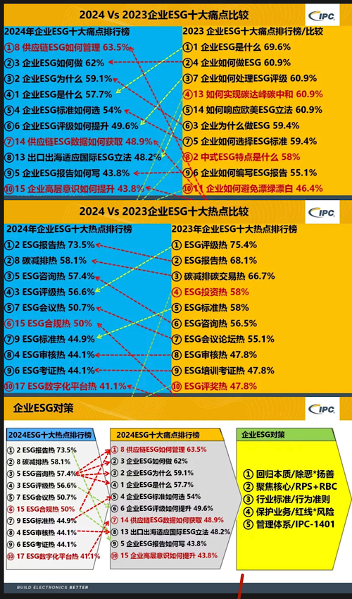 由國際電子工業(yè)聯(lián)接協(xié)會IPC-1401ESG管理體系標(biāo)準(zhǔn)技術(shù)組(以下簡稱“IPC-1401標(biāo)準(zhǔn)技術(shù)組”)發(fā)起,公益時(shí)報(bào)可持續(xù)發(fā)展研究院等數(shù)十家單位協(xié)辦,“2024企業(yè)ESG十大熱點(diǎn)十大痛點(diǎn)”調(diào)查結(jié)果在上海2024IPC中國電子制造業(yè)年會ESG可持續(xù)發(fā)展論壇正式發(fā)布。“ESG報(bào)告熱”位居十大熱點(diǎn)之首,得票率73.5%,從2023年的第二名上升一位。去年熱點(diǎn)第一名“ESG評級熱”下滑至第四名。“供應(yīng)鏈ESG管理”位居十大痛點(diǎn)之首,得票率63.5%,首次進(jìn)入前十。2023年痛點(diǎn)第一名“ESG是什么”下滑至第四名。