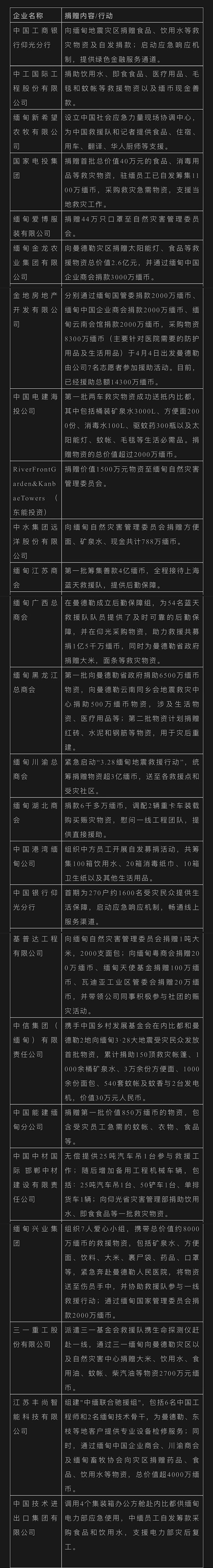 名為“CECCM”標稱“緬甸中國企業(yè)商會”的微信公眾號多日來記錄中國企業(yè)在緬援助行動:國家電投、金地地產(chǎn)、緬甸江蘇商會等籌集現(xiàn)金,用于采購物資與調(diào)配設(shè)備;工商銀行仰光分行、中工國際、中國電建海投等企業(yè)捐贈食品、醫(yī)療用品等物資,保障受災(zāi)群眾生活和醫(yī)療需求。