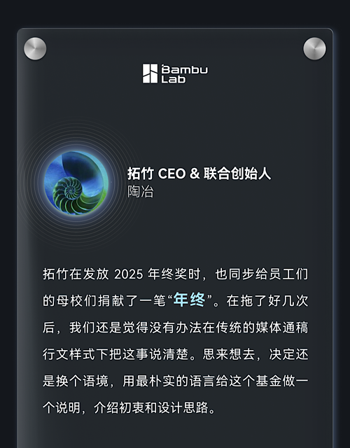 28日,拓竹CEO、聯(lián)合創(chuàng)始人陶冶通過微信公眾號發(fā)布文章《關(guān)于拓竹給員工母校捐一個億這件事,我們想多說兩句》,就為何設(shè)立該基金、捐贈高校的選擇以及基金的使用等問題作出詳細(xì)說明。
