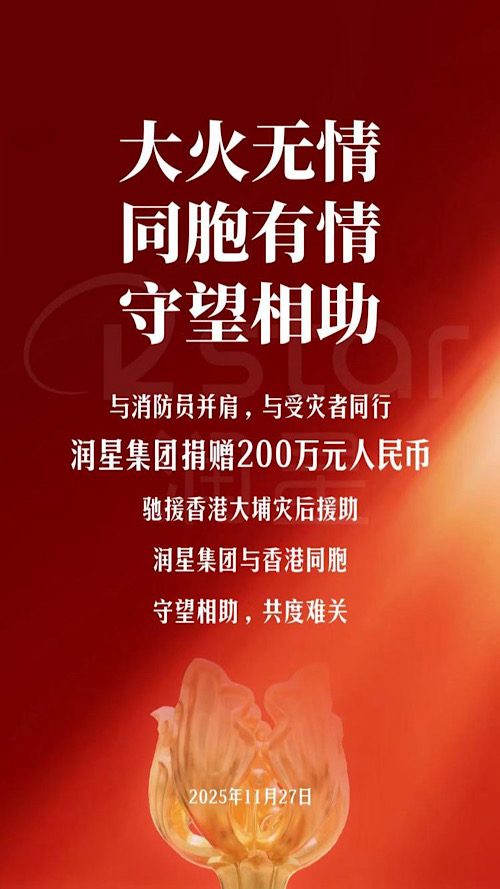 11月26日下午,香港新界大埔宏福苑多棟住宅樓發(fā)生火災(zāi),造成重大人員傷亡和財產(chǎn)損失,令人痛心。為響應(yīng)緊急需求,協(xié)助受災(zāi)同胞渡過難關(guān),潤星集團(tuán)11月27日宣布,通過中國紅十字會總會捐贈200萬元人民幣,用于支持受災(zāi)地區(qū)的緊急救援、物資采購、災(zāi)民安置及心理輔導(dǎo)等專項(xiàng)工作。