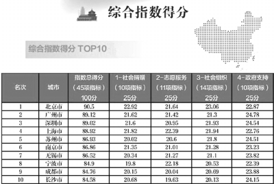 11月5日,中國慈善聯(lián)合會在廣州發(fā)布第五屆中國城市公益慈善指數(shù)。數(shù)據(jù)顯示,2016至2017年間,我國城市社會捐贈穩(wěn)步增長,社會組織數(shù)量持續(xù)增加,政府支持力度不斷加大,全國城市慈善事業(yè)呈現(xiàn)出健康、快速發(fā)展的態(tài)勢。其中,北京、廣州、深圳、上海、蘇州、南京、無錫、寧波、成都、長沙等城市的綜合指數(shù)位居全國前列。