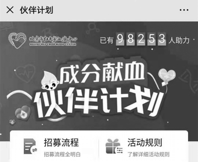 在無償獻(xiàn)血者的招募中,北京市紅十字血液中心也早早引入了“互聯(lián)網(wǎng)+”技術(shù),其中最為亮眼的莫過于首都成分獻(xiàn)血“伙伴計劃”項目。