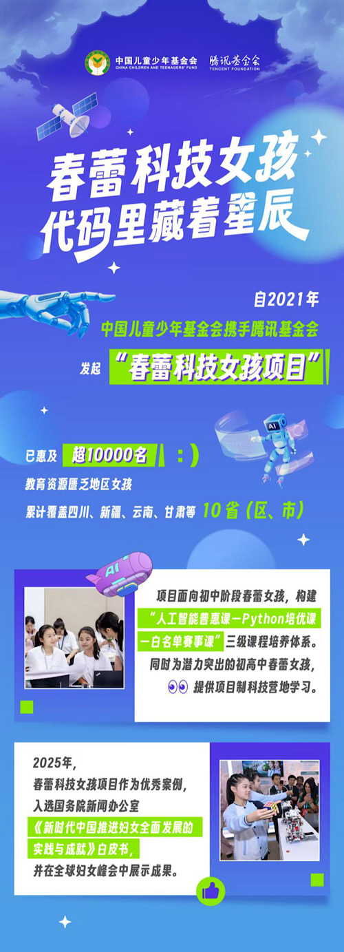 “春蕾科技女孩”項(xiàng)目由中國兒童少年基金會與騰訊公益慈善基金會于2021年共同發(fā)起實(shí)施,面向初高中階段的春蕾女孩,圍繞AIGC等前沿科技、文化自信等內(nèi)容開展科技營地項(xiàng)目制學(xué)習(xí),打造初中科技普惠課程+高中研學(xué)實(shí)踐體系化培養(yǎng)模式,持續(xù)提升女孩科技素養(yǎng)與數(shù)字技能,助力她們在科技領(lǐng)域長遠(yuǎn)發(fā)展,截至目前,項(xiàng)目已在四川、新疆、云南、貴州等10省(區(qū)市)落地,幫助超萬名春蕾女童打破性別與地域雙重限制,在科技領(lǐng)域綻放獨(dú)特光彩。
