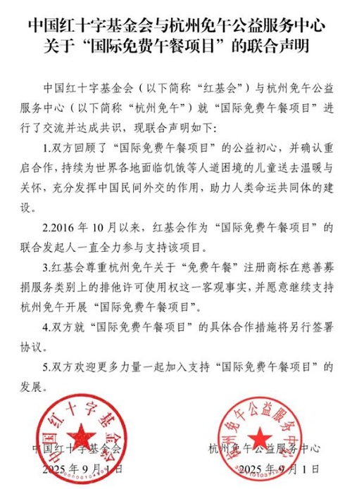 中國(guó)紅十字基金會(huì)與杭州免午公益服務(wù)中心關(guān)于“國(guó)際免費(fèi)午餐項(xiàng)目”的聯(lián)合聲明