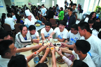 因為下雨,原本安排在家園院子里的“團圓飯”改在了食堂里,熱烈而溫馨的氣氛讓人們忘記了屋外冷雨的寒意。