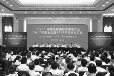 2018年7月5日,“1+1”中國法律援助志愿者行動(dòng)2018年度啟動(dòng)儀式在北京人民大會(huì)堂舉行,司法部部長傅政華向志愿者代表授旗。今年的“1+1”法律援助志愿者行動(dòng)以扶貧攻堅(jiān)為主題,共派出140名律師志愿者以及98名大學(xué)生志愿者和基層法律服務(wù)工作者,奔赴中西部地區(qū)15個(gè)省(區(qū))的140個(gè)縣(區(qū))開展法律援助工作,服務(wù)當(dāng)?shù)胤ㄖ谓ㄔO(shè)。