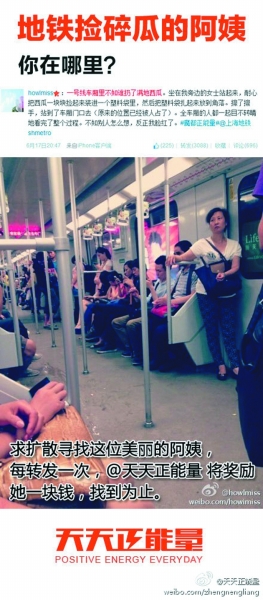 2013年6月,上海地鐵一號(hào)線擁擠的車廂里,不知誰(shuí)扔了一地西瓜皮,人來(lái)人往卻都視若無(wú)睹。一位女阿姨從座位上站起來(lái),耐心把西瓜皮一塊塊撿起裝進(jìn)塑料袋,扎起來(lái)放到角落,然后擦了擦手,站到車廂門口(她的座位已經(jīng)被人占了)。