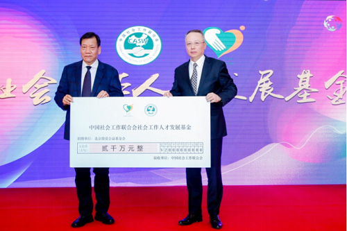 年會(huì)上,為弘揚(yáng)社工精神,推動(dòng)社會(huì)工作的持續(xù)發(fā)展,號(hào)召全社會(huì)關(guān)注和參與社會(huì)工作,北京微愛公益基金會(huì)向中國(guó)社會(huì)工作聯(lián)合會(huì)社會(huì)工作人才發(fā)展基金捐贈(zèng)2000萬元。中國(guó)社會(huì)工作聯(lián)合會(huì)換屆負(fù)責(zé)人陳存根書記代表中國(guó)社會(huì)工作聯(lián)合會(huì)接受了捐贈(zèng),并向捐贈(zèng)方代表、北京微愛公益基金會(huì)執(zhí)行理事長(zhǎng)王政頒發(fā)感謝證書。