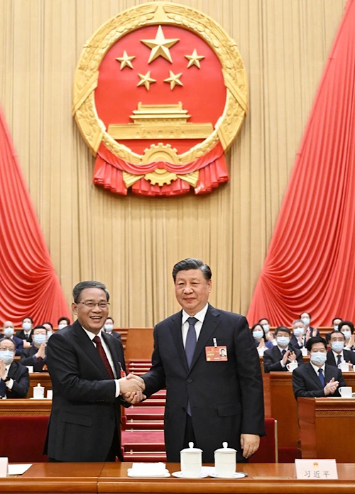 3月11日,十四屆全國(guó)人大一次會(huì)議在北京人民大會(huì)堂舉行第四次全體會(huì)議,根據(jù)國(guó)家主席習(xí)近平的提名,經(jīng)過(guò)投票表決,決定李強(qiáng)為中華人民共和國(guó)國(guó)務(wù)院總理。這是習(xí)近平同李強(qiáng)握手。新華社記者 李學(xué)仁 攝