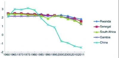 1960年至2011年,中國與若干非洲國家瘧疾發(fā)病率Log10(1/10000)