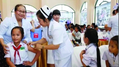 2015年,老撾兒童接種中國研發(fā)并生產(chǎn)的乙腦疫苗