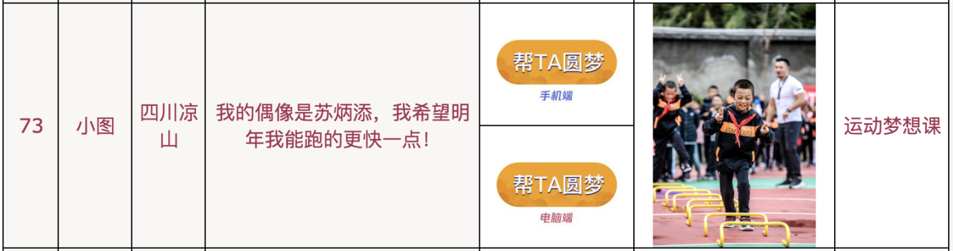 在“小紅花愿望清單”中,一名四川涼山男孩小圖的愿望被記錄下來(lái):我的偶像是蘇炳添,我希望明年能跑得更快一點(diǎn)!
