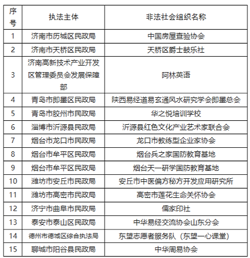 在山東,山東省民政廳近日向社會(huì)集中公布了一批民政部門依法取締、勸散的非法社會(huì)組織名單,見下圖——