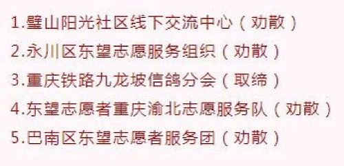 重慶市民政局近日向社會(huì)集中公布2023年第一批非法社會(huì)組織名單,包括:璧山陽光社區(qū)線下交流中心(勸散)、永川區(qū)東望志愿服務(wù)組織(勸散)、重慶鐵路九龍坡信鴿分會(huì)(取締)、東望志愿者重慶渝北志愿服務(wù)隊(duì)(勸散)、巴南區(qū)東望志愿者服務(wù)團(tuán)(勸散)。