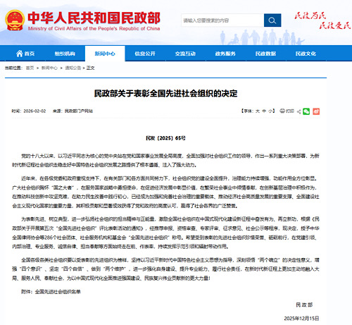 2月2日,民政部發(fā)布了《民政部關(guān)于表彰全國先進(jìn)社會組織的決定》。根據(jù)《民政部關(guān)于開展第五次“全國先進(jìn)社會組織”評比表彰活動的通知》要求,經(jīng)推薦申報、資格審查、專家評審、征求意見、社會公示等程序,民政部授予286個社會團(tuán)體、社會服務(wù)機(jī)構(gòu)和基金會“全國先進(jìn)社會組織”稱號。其中,中國殘疾人福利基金會憑借40多載深耕助殘公益的卓越成效與責(zé)任擔(dān)當(dāng)榮獲表彰。