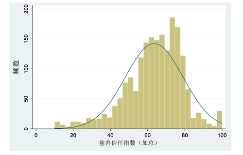中國網(wǎng)民慈善信任指數(shù)總分分布直方圖