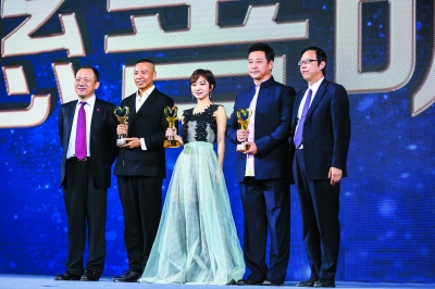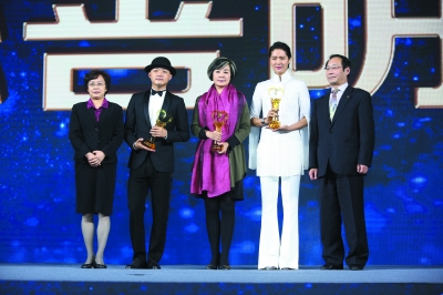 上圖:中國華僑公益基金會秘書長何繼寧(右一)和中國社會福利基金會理事長戚學森(左一)為年度慈善明星王子子(左二)、曾黎(中)和李光潔(右一)頒獎。