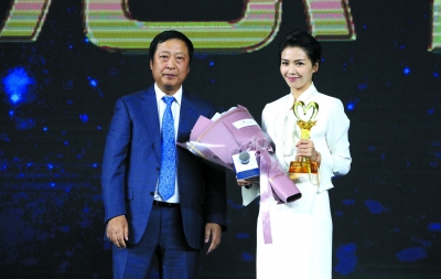 中國主持人專業(yè)委員會獲頒,中社社會工作發(fā)展基金會理事長趙蓬奇為主持人專業(yè)委員會會長楊柳(右)頒發(fā)了獎杯。