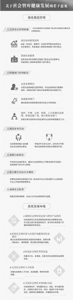 在鼓勵社會智庫發(fā)展的同時,《意見》要求從強化自身建設和強化規(guī)范管理兩個方面保證社會智庫的良性運行。