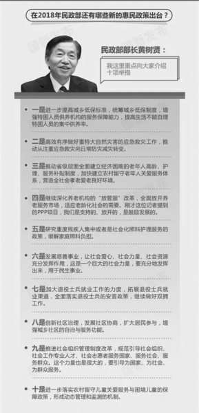 在回答記者提問(wèn)時(shí),黃樹(shù)賢表示,2018年民政部將堅(jiān)持以人民為中心的發(fā)展思想,全面貫徹落實(shí)黨中央、國(guó)務(wù)院部署的重點(diǎn)工作。他重點(diǎn)介紹了包括發(fā)展慈善事業(yè)等十項(xiàng)舉措。
