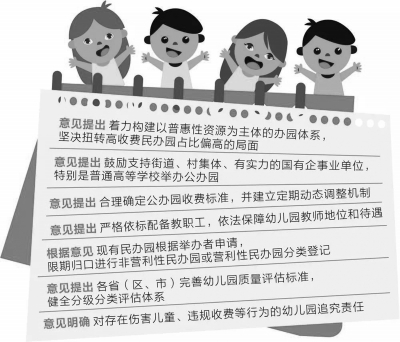 《意見》強調(diào),各地要把發(fā)展普惠性學前教育作為重點任務,結(jié)合本地實際,著力構(gòu)建以普惠性資源為主體的辦園體系,堅決扭轉(zhuǎn)高收費民辦園占比偏高的局面。