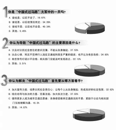 ■ 本報(bào)記者 張雪弢 近日,網(wǎng)友“這個(gè)絕對(duì)有意思”發(fā)布了這樣一則微博:“中國(guó)式過(guò)馬路,就是湊夠一撮人就可以走了,和紅綠燈無(wú)關(guān)?!蔽⒉┡鋱D中,雖然從照片上看不到交通信號(hào)燈,但有好幾位行人并沒(méi)有走在斑馬線上,而是走在旁邊的機(jī)動(dòng)車變道路標(biāo)上,其中有推著嬰兒車的老人,也有電動(dòng)車、賣(mài)水果的三輪車。 這條微博引起了不少網(wǎng)友的共鳴,一天內(nèi)被近10萬(wàn)網(wǎng)友轉(zhuǎn)發(fā)。經(jīng)央視等媒體報(bào)道后,再次引爆網(wǎng)絡(luò)。 有評(píng)論說(shuō):“只要一個(gè)人敢?guī)ь^闖紅燈,剩下的人就跟著一起了”的現(xiàn)狀,透露出群眾對(duì)規(guī)則缺少敬畏心理,“法不責(zé)眾”的思想也在人們心里根深蒂固,“群膽效應(yīng)”的后果就是集體違章。網(wǎng)友建議,要治好“中國(guó)式過(guò)馬路”的“暗傷”,就得下“猛藥”,結(jié)合城市實(shí)際,制定相適應(yīng)的獎(jiǎng)懲制度,做到有法可依,運(yùn)用執(zhí)法的力量,加大處罰力度。 然而,行人不論“紅綠燈”搶著過(guò)馬路僅僅是行人的素質(zhì)問(wèn)題?加大懲罰就可以解決問(wèn)題?《公益時(shí)報(bào)》與搜狐公益聯(lián)手推出的“益調(diào)查”結(jié)果顯示,40.34%的網(wǎng)友表示不曾是“中國(guó)式過(guò)馬路”大軍中的一員,并且以后也不會(huì)是;37.53%的網(wǎng)友認(rèn)為導(dǎo)致“中國(guó)式過(guò)馬路”的主要原因是:大眾對(duì)公民社會(huì)責(zé)任的意識(shí)淡薄,不能從自身做起。 調(diào)查結(jié)果: 本次調(diào)查從10月19日14時(shí)至10月21日22時(shí),共有6191位網(wǎng)友參與調(diào)查。 “益調(diào)查”結(jié)果顯示,40.34%網(wǎng)友明確表示,以前不是“中國(guó)式過(guò)馬路”大軍中的一員,以后也不會(huì)是;34.26%的網(wǎng)友則表示曾經(jīng)是,以后是不是也要視情況而定;19.97%的網(wǎng)友表示,曾經(jīng)是“中國(guó)式過(guò)馬路”大軍中的一員,但以后不會(huì)了。 在大家心中,導(dǎo)致“中國(guó)式過(guò)馬路”的主要原因是什么呢? 參與調(diào)查的網(wǎng)友中,37.53%的網(wǎng)友認(rèn)為“大眾對(duì)公民社會(huì)責(zé)任的意識(shí)淡薄,不能從自身做起”導(dǎo)致了“中國(guó)式過(guò)馬路”的產(chǎn)生;34.85%的網(wǎng)友則認(rèn)為是從眾心理,并且這樣過(guò)馬路的人不覺(jué)得行人違反交通規(guī)則是多嚴(yán)重的錯(cuò)誤,也不認(rèn)為有多危險(xiǎn);同時(shí),也有22.13%的網(wǎng)友認(rèn)為有些信號(hào)燈設(shè)計(jì)不合理,相關(guān)部門(mén)沒(méi)能及時(shí)發(fā)現(xiàn)改正。 那么,解決“中國(guó)式過(guò)馬路”首先要從哪方面著手? 37.03%的網(wǎng)友認(rèn)為,要結(jié)合勸導(dǎo)與執(zhí)法的力量,完善法規(guī),加大執(zhí)法力度;32.62%的網(wǎng)友則表示,應(yīng)該加大宣傳力度,培養(yǎng)公民社會(huì)責(zé)任心,讓每個(gè)人從自身做起,形成良好的社會(huì)氛圍;也有部分網(wǎng)友選擇了“倡導(dǎo)更多人成為城市交通志愿者,親身感受維持交通路況的不易,更助于公眾與相關(guān)部門(mén)互相理解溝通?!?/p> |
