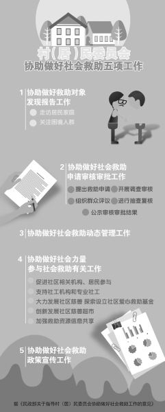 6月初,民政部發(fā)布《關(guān)于指導(dǎo)村(居)民委員會協(xié)助做好社會救助工作的意見》?!兑庖姟诽岢?,要指導(dǎo)、督促村(居)民委員會協(xié)助做好社會力量參與社會救助有關(guān)工作,積極促進(jìn)社區(qū)各類力量參與社會救助,為社會工作服務(wù)機(jī)構(gòu)和專業(yè)社會工作者進(jìn)入社區(qū)創(chuàng)造條件,大力發(fā)展社區(qū)慈善,鼓勵、支持社會組織、企事業(yè)單位和愛心人士等針對困境家庭和救助對象開展慈善救助,加強(qiáng)社區(qū)救助資源信息共享。 困難群眾在社區(qū) 《意見》指出,困難群眾居住在社區(qū)、生活在社區(qū)、服務(wù)依托社區(qū),因此健全完善社會救助經(jīng)辦服務(wù)體系,落實(shí)好各項社會救助政策,不斷提升基層社會救助服務(wù)水平,真正為困難群眾排憂解難,離不開村(居)民委員會的參與、協(xié)助和配合。 社會救助與社區(qū)居民利益息息相關(guān),是社區(qū)公共服務(wù)不可或缺的重要方面,同時村(居)民委員會也最了解困難群眾的生活狀況和救助需求。 《意見》強(qiáng)調(diào),各級民政部門要指導(dǎo)村(居)民委員會根據(jù)轄區(qū)幅度、人口規(guī)模等因素,安排必要的人員協(xié)助做好社會救助工作。切實(shí)加強(qiáng)經(jīng)費(fèi)保障,將村(居)民委員會協(xié)助做好社會救助工作所需經(jīng)費(fèi)納入社會救助工作經(jīng)費(fèi)統(tǒng)籌考慮,并按照“費(fèi)隨事轉(zhuǎn)”原則,適當(dāng)給予經(jīng)費(fèi)補(bǔ)助。要加強(qiáng)社會救助管理信息系統(tǒng)與社區(qū)綜合信息管理服務(wù)平臺的對接,實(shí)現(xiàn)社會救助對象數(shù)據(jù)和社區(qū)居民數(shù)據(jù)統(tǒng)一采集、多方共享。各級民政部門要有針對性地加強(qiáng)培訓(xùn)工作,確保村(居)民委員會相關(guān)工作人員熟悉、掌握社會救助政策與社會工作專業(yè)理念、方法和技巧。 《意見》還要求抓緊研究政府購買社會救助服務(wù)的機(jī)制、路徑和辦法,不斷創(chuàng)新村(居)民委員會協(xié)助做好社會救助工作的模式、方法。探索將社會組織引入社會救助,逐步拓展社會救助服務(wù)內(nèi)涵,積極指導(dǎo)村(居)民委員會以社區(qū)為平臺,統(tǒng)籌整合政府救助、慈善救助和社會服務(wù)等資源,實(shí)施形式多樣的救助服務(wù),最大程度滿足困難群眾的救助需求。 協(xié)助做好救助對象發(fā)現(xiàn)報告工作 在民政部門的指導(dǎo)下,村(居)民委員會在社會救助方面要協(xié)助完成哪些工作呢? 首先,救助對象的發(fā)現(xiàn)報告工作責(zé)無旁貸。 《意見》提出,村(居)民委員會應(yīng)該將發(fā)現(xiàn)排查困難群眾列為日常重點(diǎn)工作,安排社區(qū)工作者、專業(yè)社會工作者、志愿者等經(jīng)常性走訪居民家庭,了解、收集困難群眾的現(xiàn)狀信息,掌握、核實(shí)轄區(qū)內(nèi)居民生活困難及遭遇突發(fā)事件、意外事故、罹患重病等急難情況,并及時告知鄉(xiāng)鎮(zhèn)人民政府(街道辦事處)。指導(dǎo)、督促村(居)民委員會在日常工作中,將轄區(qū)內(nèi)的留守兒童、獨(dú)居老人、殘疾人、重病患者等易陷入生活困境的人群作為重點(diǎn),開展經(jīng)常性走訪、問候;關(guān)注居住在本轄區(qū)的外來人員,幫助有困難的家庭和個人提出救助申請。指導(dǎo)有條件的村(居)民委員會在社區(qū)公共服務(wù)場所開設(shè)救助咨詢服務(wù)窗口,開通救助服務(wù)熱線,方便困難群眾求助。 協(xié)助申請審核審批工作 一是協(xié)助提出救助申請。指導(dǎo)、督促村(居)民委員會接受申請最低生活保障、特困人員供養(yǎng)、醫(yī)療救助、教育救助、住房救助、臨時救助等社會救助的有困難的家庭或個人的委托,代其向鄉(xiāng)鎮(zhèn)人民政府(街道辦事處)或相關(guān)救助機(jī)構(gòu)提交書面申請及材料。指導(dǎo)、督促村(居)民委員會將申請人所有申請材料全部上交,不得自行做出不予受理或不符合救助條件的決定。要指導(dǎo)、督促村(居)民委員會成員及其他社區(qū)工作者主動申報備案其近親屬申請救助的情況。 二是協(xié)助開展調(diào)查審核。指導(dǎo)、督促村(居)民委員會協(xié)助鄉(xiāng)鎮(zhèn)人民政府(街道辦事處),組織駐村(社區(qū))干部、社區(qū)救助專干、專業(yè)社會工作者等工作人員,通過入戶調(diào)查、鄰里訪問等形式,對社會救助申請人聲明的家庭經(jīng)濟(jì)狀況、人口狀況、遭遇困難類型等逐一調(diào)查核實(shí),并由調(diào)查人員和申請人簽字確認(rèn)。調(diào)查審核的責(zé)任主體是鄉(xiāng)鎮(zhèn)人民政府(街道辦事處),村(居)民委員會不能自行做出調(diào)查審核結(jié)論。 三是協(xié)助組織群眾評議。指導(dǎo)、督促村(居)民委員會在入戶調(diào)查結(jié)束后,協(xié)助鄉(xiāng)鎮(zhèn)人民政府(街道辦事處)組織村(居)民代表或者群眾評議小組對救助申請人聲明的家庭收入、財產(chǎn)狀況以及入戶調(diào)查結(jié)果的客觀性、真實(shí)性和完整性進(jìn)行評議。 四是協(xié)助進(jìn)行抽查復(fù)核??h級民政部門要在村(居)民委員會的參與下開展抽查復(fù)核工作,全面、準(zhǔn)確地聽取村(居)民委員會關(guān)于入戶調(diào)查、鄰里訪問、群眾評議以及村(居)民委員會成員等社區(qū)工作人