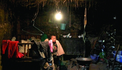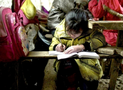 泥樹小學(xué)是兩方土屋,由于房屋破舊,學(xué)校不敢牽入電線,教室里沒有電燈,只能靠四扇漏風(fēng)的窗戶取光,而貴州山區(qū)冬天多霧少太陽,孩子們上課學(xué)習(xí)很困難,一名孩子為了能看清書本不得不蹲在地上“借光”。 |
