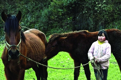 泥樹小學(xué)唯一的老師臨時有事,學(xué)校放假半天。下課后,孩子們就紛紛返回家?guī)椭依锏睦先烁杉覄?wù),圖中是一名小女孩從家里牽出的兩匹瘦馬。 |