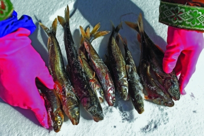 巡護(hù)隊(duì)員萬(wàn)瑪才讓小心地托著一條從網(wǎng)上摘下的足有30公分長(zhǎng)的湟魚。幸運(yùn)的是,這條湟魚還活著。他說(shuō),這條魚有幾十歲大了,非常珍貴。當(dāng)它被小心翼翼地放回冰洞,一扭身,瞬間在大家視線中消失時(shí),所有人鼓起掌來(lái)。 |