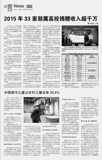 2015年33家部屬高校捐贈收入超千萬