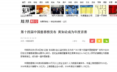 2017年4月26日,北京雁棲湖APEC國(guó)際會(huì)展中心。 在藍(lán)天白云的映照下,這座中式建筑群落顯得格外亮眼。與之交相輝印的,是一群中國(guó)慈善人。 會(huì)展中心場(chǎng)內(nèi)人聲鼎沸,鎂光燈不停閃爍,每個(gè)人臉上都洋溢著溫暖的笑容。這里正在隆重舉行的是由《公益時(shí)報(bào)》社主辦的第十四屆(2017)中國(guó)慈善榜發(fā)布盛典。 慈善的力量 此次盛典匯聚了知名慈善家、慈善明星、慈善企業(yè)和各界愛(ài)心人士數(shù)百人,還有來(lái)自國(guó)內(nèi)外的數(shù)十家媒體記者,他們聚集一堂,共同見(jiàn)證著過(guò)去一年來(lái)慈善在中華大地上結(jié)下的豐碩成果。慈善榜發(fā)布現(xiàn)場(chǎng)更像是一個(gè)愛(ài)的磁場(chǎng),向整個(gè)社會(huì)傳遞著中國(guó)慈善的電波。 本屆慈善榜發(fā)布活動(dòng)吸引了國(guó)內(nèi)眾多媒體的熱情關(guān)注和報(bào)道。 新華網(wǎng)以“第十四屆中國(guó)慈善榜發(fā)布 鋼絲善行團(tuán)獲特別貢獻(xiàn)獎(jiǎng)”為題,對(duì)本次活動(dòng)中低調(diào)神秘的“隱形慈善家”鋼子和他的“鋼絲善行團(tuán)”進(jìn)行了報(bào)道。其中較為詳細(xì)地介紹了“鋼絲善行團(tuán)”的幾位骨干成員和他們的感人事跡。 中國(guó)青年網(wǎng)將關(guān)注的視角投向本屆慈善榜首度推出的“年度十大慈善項(xiàng)目”,并對(duì)獲得此次殊榮之一的“水滴籌”項(xiàng)目所帶來(lái)的社會(huì)正能量予以了充分肯定。文中說(shuō)道:“水滴籌此次能夠獲得“年度十大慈善項(xiàng)目”稱(chēng)號(hào),是中國(guó)慈善榜的權(quán)威評(píng)委們對(duì)水滴籌在推動(dòng)社會(huì)公益救助領(lǐng)域的發(fā)展上所做出貢獻(xiàn)的充分肯定,也是網(wǎng)絡(luò)個(gè)人大病救助平臺(tái)首次獲得國(guó)內(nèi)公正權(quán)威機(jī)構(gòu)的認(rèn)可。” 搜狐網(wǎng)報(bào)道了榮膺中國(guó)十大慈善家之“最具情懷慈善家獎(jiǎng)”的劉滄龍先生,并將組委會(huì)授予劉滄龍主席“中國(guó)十大慈善家之最具情懷慈善家”的頒獎(jiǎng)詞進(jìn)行轉(zhuǎn)載:“宏則龍騰滄海,達(dá)則兼善天下。他認(rèn)為,一個(gè)好的企業(yè)要為顧客提供優(yōu)秀的產(chǎn)品和服務(wù),而一個(gè)偉大的企業(yè)還要竭盡全力使這個(gè)世界變得更加美好……” 鳳凰網(wǎng)對(duì)獲得本屆慈善榜“慈善榜樣”的中海軟銀投資管理有限公司總裁潘世梁先生多年來(lái)對(duì)公益慈善事業(yè)的推動(dòng)和貢獻(xiàn),以及積極履行企業(yè)社會(huì)責(zé)任的突出表現(xiàn)進(jìn)行了總結(jié)和梳理。 網(wǎng)易新聞從全方位多角度對(duì)本次盛典進(jìn)行了盤(pán)點(diǎn)。對(duì)于廣大網(wǎng)友關(guān)注的中國(guó)慈善榜數(shù)據(jù)主要來(lái)源做了闡釋?zhuān)瑲w結(jié)為:民政系統(tǒng)接受捐贈(zèng)數(shù)據(jù)、捐贈(zèng)者提供的數(shù)據(jù)、公益機(jī)構(gòu)接受捐贈(zèng)數(shù)據(jù)、上市公司年報(bào)公布數(shù)據(jù)、媒體公開(kāi)報(bào)道的捐贈(zèng)數(shù)據(jù)以及《公益時(shí)報(bào)》的公益檔案數(shù)據(jù)等六個(gè)方面。報(bào)道還援引了《公益時(shí)報(bào)》社長(zhǎng)劉京在發(fā)布盛典致辭中表明的觀點(diǎn):“新一批大額公益捐贈(zèng)的持續(xù)涌現(xiàn),彰顯了中國(guó)企業(yè)家的時(shí)代特征,我們可以明確的向社會(huì)宣告,中國(guó)慈善家的群體正在形成?!?/p> 南方網(wǎng)、中華網(wǎng)、新浪網(wǎng)、中國(guó)新聞網(wǎng)、中國(guó)廣播網(wǎng)等多家媒體均從不同層面和角度對(duì)第十四屆中國(guó)慈善榜進(jìn)行了報(bào)道。 公益時(shí)報(bào)社和北京時(shí)間首次專(zhuān)門(mén)為中國(guó)慈善榜開(kāi)辟了網(wǎng)絡(luò)直播。這一新的嘗試頗引人關(guān)注。無(wú)論是盛典開(kāi)幕前,公益時(shí)報(bào)社記者在現(xiàn)場(chǎng)發(fā)回的綜合報(bào)道,還是直播專(zhuān)訪參加本次盛典的慈善家和慈善明星,網(wǎng)友在線點(diǎn)擊量成績(jī)都不俗,網(wǎng)友互動(dòng)交流相當(dāng)踴躍。 榜樣的力量 各路媒體的報(bào)道,將人們帶回到當(dāng)天的慈善榜發(fā)布盛典現(xiàn)場(chǎng)。來(lái)到這里的,有像世紀(jì)金源集團(tuán)董事局主席黃如論這樣的知名企業(yè)家,他以4.54億元人民幣的捐贈(zèng)位列慈善家榜單首位;也有像鋼子這樣一直默默致力于慈善事業(yè),至今不愿以真實(shí)姓名公諸于世的低調(diào)“隱形”慈善家。 這是中國(guó)最具影響力的慈善發(fā)布大會(huì)。本屆上榜慈善家共201位,2017年度合計(jì)捐贈(zèng)74.12億元;上榜慈善企業(yè)414家,總捐贈(zèng)額達(dá)到71.15億元,世紀(jì)金源集團(tuán)董事局主席黃如論則以他的巨額捐贈(zèng)成為新一屆中國(guó)首善。 這是中國(guó)最具明星號(hào)召力的慈善盛典。知名演員劉濤特意從片場(chǎng)請(qǐng)假來(lái)到中國(guó)慈善榜發(fā)布盛典的現(xiàn)場(chǎng),她動(dòng)情地講述了發(fā)生在自己身邊的愛(ài)心小故事,呼喚公眾“用愛(ài)和分享幫助更多的人。”演員包貝爾、李光潔、叢珊紛紛表示,自己在慈善公益的道路上才剛剛起步,未來(lái)的日子他們會(huì)嘗試更多地投身慈善事業(yè)。 許多普通人也在為中國(guó)慈善