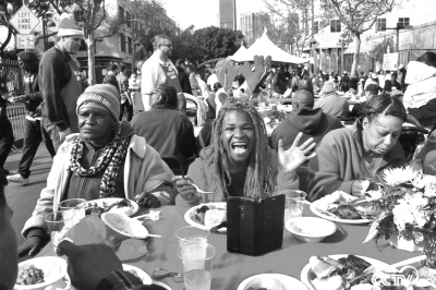 當(dāng)?shù)貢r間2017年12月22日,美國加州洛杉磯,“洛杉磯任務(wù)(Los Angeles Mission)”組織一年一度的圣誕節(jié)大餐,志愿者戴圣誕帽為無家可歸者送上美食。