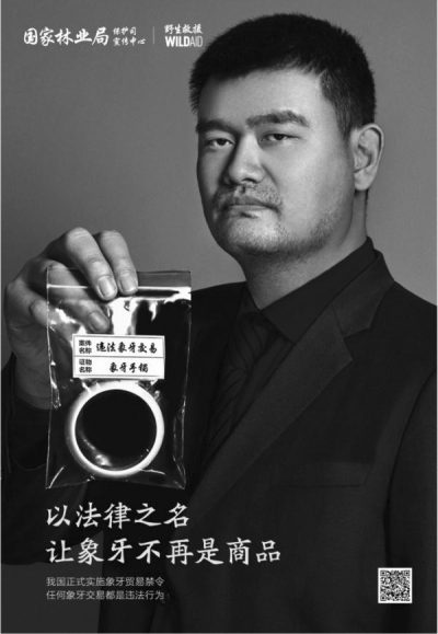 2017年12月29日下午,國家林業(yè)局官方微博聯(lián)合國際環(huán)保組織“野生救援”發(fā)布由公益大使姚明拍攝的最新公益廣告《以法律之名,讓象牙不再是商品》,呼吁公眾遵守法律禁止象牙買賣。2017年12月31日,中國禁止國內(nèi)象牙商業(yè)性貿(mào)易全面實(shí)現(xiàn)。從這一天開始,買賣象牙在中國大陸是違法行為,將面臨法律制裁。