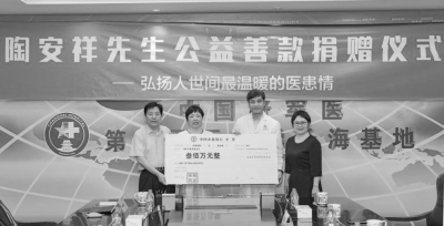 2018年6月4日,“助力醫(yī)學(xué)科研,弘揚(yáng)公益精神”捐贈(zèng)活動(dòng)在上海長(zhǎng)海醫(yī)院臨床會(huì)診中心隆重舉行。吳階平醫(yī)學(xué)基金會(huì)獲腦梗治愈患者陶安祥300萬(wàn)元捐款,該筆善款將專(zhuān)款用于該院劉建民教授領(lǐng)導(dǎo)的腦卒中醫(yī)學(xué)科研項(xiàng)目的研究。 吳階平醫(yī)學(xué)基金會(huì)腦卒中醫(yī)學(xué)科研項(xiàng)目旨在推進(jìn)腦血管病防治工作,積極提高腦卒中的診治與管理水平,推動(dòng)國(guó)內(nèi)卒中中心和卒中網(wǎng)絡(luò)的建設(shè)。腦卒中即俗稱(chēng)的“中風(fēng)”,是致死、致殘率非常高的疾病。中國(guó)每年新增350萬(wàn)中風(fēng)病人,并且中風(fēng)的發(fā)病率仍在逐年增長(zhǎng),年增長(zhǎng)率高達(dá)8.7%,中國(guó)腦卒中死亡患者占全球腦卒中死亡的29.4%。面對(duì)我國(guó)如此嚴(yán)峻的腦卒中發(fā)病現(xiàn)狀及趨勢(shì),提高腦卒中的防控水平和卒中后的救治效率是重中之重。 2016年,農(nóng)民出身、白手起家的陶安祥已是江蘇亞星錨鏈有限公司董事長(zhǎng),被譽(yù)為世界錨鏈大王,享有“江蘇省勞動(dòng)模范”榮譽(yù)稱(chēng)號(hào)。彼時(shí),他卻時(shí)常感到頭暈乏力、力不從心。面對(duì)身體的極度不適,陶安祥來(lái)到上海長(zhǎng)海醫(yī)院就診,后經(jīng)長(zhǎng)海醫(yī)院神經(jīng)外科確診為腦梗塞。然而,讓醫(yī)生頭疼的是,陶安祥的動(dòng)脈非常狹窄,導(dǎo)致病情非常棘手。 隨后,該院劉建民教授及其團(tuán)隊(duì)對(duì)陶安祥的病情分析,制定詳細(xì)治療方案,令陶安詳?shù)牟∏橛兴棉D(zhuǎn)直至康復(fù)。 2017年10月,陶安祥看到了關(guān)于吳階平醫(yī)學(xué)基金會(huì)腦卒中學(xué)部成立,并得知?jiǎng)⒔駥?dān)任吳階平醫(yī)學(xué)基金會(huì)腦卒中學(xué)部首屆主任委員的消息。當(dāng)下,他決定為吳階平醫(yī)學(xué)基金會(huì)卒中學(xué)部捐資,支持劉建民在醫(yī)學(xué)科普宣教、醫(yī)生專(zhuān)業(yè)技術(shù)培訓(xùn)等方面的工作,實(shí)現(xiàn)他對(duì)推動(dòng)中國(guó)腦卒中救治工作發(fā)展的偉大理想。 劉建民表示:“醫(yī)患關(guān)系是魚(yú)水關(guān)系,魚(yú)和水彼此依賴(lài),不可分離。陶安祥先生的捐贈(zèng)是對(duì)我們醫(yī)療技術(shù)和服務(wù)質(zhì)量的肯定,抗擊腦卒中是一場(chǎng)攻堅(jiān)戰(zhàn),任務(wù)艱巨,需要社會(huì)力量的多方合作和廣泛參與。” (張明敏) |