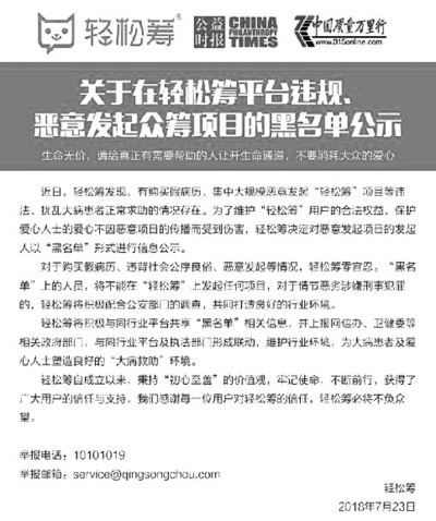 “行動啟動后,輕松籌將與國家職能部門和社會各方共同發(fā)力,向假病歷‘黑產(chǎn)’和惡意發(fā)起項目等不良行為揮出重拳,共同守護好每一份愛心,讓它們都能流向真正需要幫助的人。” 8月16日,在人民網(wǎng)一號演播廳,隨著主持人宣布一項名為“輕松助善”的公益行動的開啟,國內(nèi)最大健康保障平臺輕松籌面對上百家到場媒體正式發(fā)布“打假”宣言,向“假病歷”黑色產(chǎn)業(yè)鏈和惡意發(fā)起項目等不良行為宣戰(zhàn)。 成立近4年來,輕松籌借助互聯(lián)網(wǎng)技術(shù),首創(chuàng)借助“熟人社交”網(wǎng)絡(luò)特點的大病眾籌體系,收獲注冊用戶5.5億,為160萬個家庭籌集超過200億元的善款,創(chuàng)造了不小的網(wǎng)絡(luò)健康扶貧奇跡。 進入今年以來,以假病歷騙捐和惡意發(fā)起項目等不良行為嚴(yán)重干擾了以輕松籌為代表的大病眾籌平臺。輕松籌此番發(fā)布“打假”宣言,并通過升級具體手段盡可能杜絕“騙捐”等丑惡行為,對關(guān)乎生命的大病救助行業(yè)可謂一項及時之舉。 連續(xù)出臺“打假”舉措 7月23日,輕松籌發(fā)布大病救助領(lǐng)域首份“黑名單”,購買假病歷、違背社會公序良俗、惡意發(fā)起項目等被公示用戶,將不能在輕松籌上發(fā)起人任何項目,這一做法得到了同行企業(yè)的紛紛響應(yīng)。未來,大病救助領(lǐng)域?qū)⒂型俪珊诿麊喂蚕頇C制,并與衛(wèi)健委、網(wǎng)信辦等相關(guān)部門共同促進懲戒措施落地。 而在此之前的近兩個月時間內(nèi),輕松籌就多次向上述影響精準(zhǔn)健康扶貧的不良社會現(xiàn)象揮出重拳,引起了同行業(yè)企業(yè)及社會的共鳴,為精準(zhǔn)健康扶貧打造良好環(huán)境的呼聲因此不斷高漲。 5月31日,輕松籌宣布整改措施,將在醫(yī)院溝通、增加審核申報材料、增加現(xiàn)場真人視頻驗證、強化先行賠付等方面投入更大的精力。 6月29日,輕松籌針對假病歷“騙捐”的現(xiàn)象發(fā)表聲明,倡議向假病歷黑產(chǎn)和騙捐宣戰(zhàn),讓捐款流向真正需要幫助的人。 7月23日,輕松籌發(fā)布了行業(yè)首份黑名單,對于購買假病歷、違背社會公序良俗、惡意發(fā)起項目的發(fā)起人,將不能在輕松籌上發(fā)起任何項目。 “如何面對惡意發(fā)起的項目,如何面對每一個普通網(wǎng)民的愛心,是我們需要解決的問題,也是我們應(yīng)當(dāng)扛起的責(zé)任。”8月16日,輕松籌創(chuàng)始人、CEO楊胤表示:“希望不斷完善相關(guān)政策,打造一個良好的社會環(huán)境、輿論氛圍,吸引更多的愛心人士,讓社會善心成為習(xí)慣?!?/p> 假病歷困擾行業(yè)發(fā)展 “從一開始,輕松籌最大的敵人就是假病歷‘黑產(chǎn)’等詐捐行為。我們一直投入大量精力、技術(shù)和財力去研究防范、分辨假病歷?!陛p松籌聯(lián)合創(chuàng)始人、COO于亮直言不諱。 假病歷由何而來?是來自醫(yī)院本身嗎? 盧道培醫(yī)療集團CEO路陽對此明確否定,他說:“病歷是醫(yī)院最基本的質(zhì)量管理,也是向患者收費的依據(jù),假病歷只能來源于‘患者’自身仿制?!?/p> 據(jù)《南方都市報》等知名媒體報道,市面上有為數(shù)不少能夠仿制醫(yī)院門診病歷、診斷書的中介,許多中介甚至可以仿制三甲醫(yī)院的病歷,這些病歷多數(shù)用來騙取假期,更有甚者則流入大病救助領(lǐng)域,套取社會愛心人士的善款。 2016年,《慈善法》出臺,但并未對個人求助領(lǐng)域進行調(diào)整,這也為這一領(lǐng)域埋下了隱患。但北京大學(xué)法學(xué)院院長助理、非營利組織法研究中心主任金錦萍認(rèn)為,若通過專門的法律條文對個人求助進行規(guī)制,很有可能對這一領(lǐng)域的發(fā)展造成傷害,現(xiàn)有的《民法》《刑法》其實也可對“詐捐”等行為起到懲戒作用。 輕松籌“打假”三部曲 針對這些困擾大病救助行業(yè)的不良現(xiàn)象,輕松籌啟動的“輕松助善”公益行動除了發(fā)布“打假”的決心外,更向外界公布了三種具體的“宣戰(zhàn)”手段。 首先,通過技術(shù)升級,嚴(yán)把審核關(guān),在輕松籌大病求助通道發(fā)起的項目須通過人工、大數(shù)據(jù)等手段審核通過后才能發(fā)起籌款,上線了現(xiàn)場視頻驗證等手段; 第二,在行業(yè)內(nèi)首推“黑名單”制度,輕松籌將“黑名單”與同行業(yè)平臺共享,并上報網(wǎng)信辦、衛(wèi)健委等相關(guān)政府部門,通過多方聯(lián)動,讓黑名單發(fā)揮最大效果,懲戒不法行為,維護行業(yè)環(huán)境; 第三,暢通舉報渠道,輕松籌與國家有關(guān)部門的舉報電話均可作為舉報渠道,同時輕松籌還公布了項目頁面舉報、微博,微信等新媒體舉報渠道,依靠群眾、全民監(jiān)督,形成國家、企業(yè)、群眾多方聯(lián)動,齊抓共管的局面。 輕松籌呼吁社會各界人士共同監(jiān)督,積極提供舉報線索,讓“騙捐”完全失去生存土壤,讓每一份愛心都能流向真正需要幫助的人。 ■ 本報記者 高文興 |