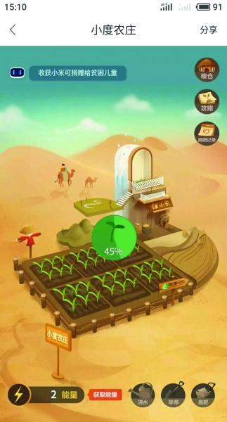 今年2月,由百度公益聯(lián)合百度地圖、阿拉善SEE生態(tài)協(xié)會(以下簡稱SEE)以及任小米推出的公益項(xiàng)目“小度農(nóng)莊”悄然上線。用戶在參與過程中不僅能夠助力環(huán)保、改善阿拉善地區(qū)生態(tài)環(huán)境,讓鄉(xiāng)村孩子吃上營養(yǎng)午餐,還能收到實(shí)實(shí)在在的線下公益產(chǎn)品。短短半年時(shí)間,該項(xiàng)目就吸引了200多萬用戶參與。那么,“小度農(nóng)莊”究竟是一個(gè)怎樣的項(xiàng)目?“線上公益產(chǎn)出+線下實(shí)物回饋”模式在未來是否可行?