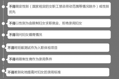 ■ 本報記者 王勇 近日,人力資源和社會保障部、教育部等,其中規(guī)定,在招聘行為中,不得限定性別(國家規(guī)定的女職工禁忌勞動范圍等情況除外)或性別優(yōu)先,不得以性別為由限制婦女求職就業(yè)、拒絕錄用婦女,不得將限制生育作為錄用條件。 《通知》強調,要依法禁止招聘環(huán)節(jié)中的就業(yè)性別歧視。各類用人單位、人力資源服務機構在擬定招聘計劃、發(fā)布招聘信息、招用人員過程中,不得限定性別(國家規(guī)定的女職工禁忌勞動范圍等情況除外)或性別優(yōu)先,不得以性別為由限制婦女求職就業(yè)、拒絕錄用婦女,不得詢問婦女婚育情況,不得將妊娠測試作為入職體檢項目,不得將限制生育作為錄用條件,不得差別化地提高對婦女的錄用標準。國有企事業(yè)單位、公共就業(yè)人才服務機構及各部門所屬人力資源服務機構要帶頭遵法守法,堅決禁止就業(yè)性別歧視行為。 要強化人力資源市場監(jiān)管。監(jiān)督人力資源服務機構建立健全信息發(fā)布審查和投訴處理機制,切實履行招聘信息發(fā)布審核義務,及時糾正發(fā)布含有性別歧視內容招聘信息的行為,確保發(fā)布的信息真實、合法、有效。對用人單位、人力資源服務機構發(fā)布含有性別歧視內容招聘信息的,依法責令改正;拒不改正的,處1萬元以上5萬元以下的罰款;情節(jié)嚴重的人力資源服務機構,吊銷人力資源服務許可證。將用人單位、人力資源服務機構因發(fā)布含有性別歧視內容的招聘信息接受行政處罰等情況納入人力資源市場誠信記錄,依法實施失信懲戒。 要建立聯(lián)合約談機制。暢通窗口來訪接待、12333、12338、12351熱線等渠道,及時受理就業(yè)性別歧視相關舉報投訴。根據(jù)舉報投訴,對涉嫌就業(yè)性別歧視的用人單位開展聯(lián)合約談,采取談話、對話、函詢等方式,開展調查和調解,督促限期糾正就業(yè)性別歧視行為,及時化解勞動者和用人單位間矛盾糾紛。被約談單位拒不接受約談或約談后拒不改正的,依法進行查處,并通過媒體向社會曝光。 要健全司法救濟機制。依法受理婦女就業(yè)性別歧視相關起訴,設置平等就業(yè)權糾紛案由。積極為遭受就業(yè)性別歧視的婦女提供法律咨詢等法律幫助,為符合條件的婦女提供法律援助。積極為符合條件的遭受就業(yè)性別歧視的婦女提供司法救助。 要支持婦女就業(yè)。加強就業(yè)服務,以女大學生為重點,為婦女提供個性化職業(yè)指導和有針對性的職業(yè)介紹,樹立正確就業(yè)觀和擇業(yè)觀。組織婦女參加適合的培訓項目,鼓勵用人單位針對產(chǎn)后返崗女職工開展崗位技能提升培訓,盡快適應崗位需求。促進3歲以下嬰幼兒照護服務發(fā)展,加強中小學課后服務,緩解家庭育兒負擔,幫助婦女平衡工作與家庭。完善落實生育保險制度,切實發(fā)揮生育保險保障功能。加強監(jiān)察執(zhí)法,依法懲處侵害女職工孕期、產(chǎn)期、哺乳期特殊勞動保護權益行為。對婦女與用人單位間發(fā)生勞動人事爭議申請仲裁的,要依法及時快速處理。 要開展宣傳引導。堅決貫徹男女平等基本國策,強化男女平等意識,逐步消除性別偏見。加大反就業(yè)性別歧視、保障婦女平等就業(yè)權利法律、法規(guī)、政策宣傳,引導全社會尊重愛護婦女,引導用人單位知法守法依法招用婦女從事各類工作,引導婦女合法理性保障自身權益。樹立一批保障婦女平等就業(yè)權利用人單位典型,對表現(xiàn)突出的推薦參加全國維護婦女兒童權益先進集體、全國城鄉(xiāng)婦女崗位建功先進集體等創(chuàng)評活動。營造有利于婦女就業(yè)的社會環(huán)境,幫助婦女自立自強,充分發(fā)揮自身優(yōu)勢特長,在各行各業(yè)展示聰明才智,體現(xiàn)自身價值。 鏈接>>> 女職工9項專屬權益 1、專屬休息室很貼心 根據(jù)《女職工勞動保護特別規(guī)定》,女職工比較多的用人單位應當根據(jù)女職工的需要,建立女職工衛(wèi)生室、孕婦休息室、哺乳室等設施,妥善解決女職工在生理衛(wèi)生、哺乳方面的困難。 對于商場、超市等需要長期站立工作的促銷員、售貨員等崗位的女職工,單位要在其工作場所設立工間休息座位。 2、“特殊時期”照顧多 目前,至少19個省份實施了“痛經(jīng)假”,允許女職工在特殊時期休息1天或2天,但各地規(guī)定并不一致,有的規(guī)定只需提供醫(yī)療機構證明即可,有的則限定了工種,只允許“第三級體力勞動強度”、“從事長久站立、行走勞動”等工種的女職工休“痛經(jīng)假”。 3、“補貼”每月多一份 目前,許多省、市地區(qū)都明確了女職工每月可領取一定衛(wèi)生用品補助費。近年來,隨著物價上漲,這筆“補貼”也水漲船高。 如河北從2015年11月1日起,女職工衛(wèi)生費每人每月4至6元或相應的衛(wèi)生用品調整提高為每人每月30元或相應的衛(wèi)生用品。 黑龍江從2009年3月1日起,女職工衛(wèi)生用品補助費由每人每月10元提高到每人每月20元。 山西則明確用人單位需為女職工發(fā)放每人每月不低于30元的衛(wèi)生費,一年至少一次婦科檢查、“兩癌”專項檢查、2%的一次性營養(yǎng)補助、職業(yè)健康檢查。 4、“人生大事”不折騰 女職工們如何在工作之余不用為結婚、生子等“人生大事”煩神?放心,這些法律保證你在經(jīng)歷“人生大