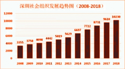 從登記數(shù)量來看,深圳市的社會組織總量從2008年的3355家,以11.79%的年平均增長率增長至2018年的10230家;每萬名常住人口擁有社會組織的數(shù)量從2008年的3.52個,增長到2018年的8.03個,萬人社會組織擁有量居全國一線城市之首。