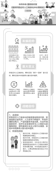 ■ 本報記者 王勇 為積極應(yīng)對人口老齡化,按照黨的十九大決策部署,近日,中共中央、國務(wù)院印發(fā)了《國家積極應(yīng)對人口老齡化中長期規(guī)劃》(以下簡稱《規(guī)劃》)?!兑?guī)劃》近期至2022年,中期至2035年,遠期展望至2050年,是到本世紀中葉我國積極應(yīng)對人口老齡化的戰(zhàn)略性、綜合性、指導性文件。 《規(guī)劃》明確了積極應(yīng)對人口老齡化的戰(zhàn)略目標,即積極應(yīng)對人口老齡化的制度基礎(chǔ)持續(xù)鞏固,財富儲備日益充沛,人力資本不斷提升,科技支撐更加有力,產(chǎn)品和服務(wù)豐富優(yōu)質(zhì),社會環(huán)境宜居友好,經(jīng)濟社會發(fā)展始終與人口老齡化進程相適應(yīng),順利建成社會主義現(xiàn)代化強國,實現(xiàn)中華民族偉大復興的中國夢。 到2022年,我國積極應(yīng)對人口老齡化的制度框架初步建立;到2035年,積極應(yīng)對人口老齡化的制度安排更加科學有效;到本世紀中葉,與社會主義現(xiàn)代化強國相適應(yīng)的應(yīng)對人口老齡化制度安排成熟完備。 《規(guī)劃》從5個方面部署了應(yīng)對人口老齡化的具體工作任務(wù)。 我國老齡化程度將持續(xù)加深 人口老齡化是社會發(fā)展的重要趨勢,是人類文明進步的體現(xiàn),也是今后較長一段時期我國的基本國情。我國自20世紀末進入老齡化社會以來,老年人口數(shù)量和占總?cè)丝诘谋戎爻掷m(xù)增長,2000年至2018年,60歲及以上老年人口從1.26億人增加到2.49億人,老年人口占總?cè)丝诘谋戎貜?0.2%上升至17.9%。未來一段時間,老齡化程度將持續(xù)加深。 國家發(fā)展改革委負責人就《國家積極應(yīng)對人口老齡化中長期規(guī)劃》答記者問時表示,積極應(yīng)對人口老齡化,是黨中央、國務(wù)院正確把握人口發(fā)展大趨勢和老齡化規(guī)律,作出的立足當下、著眼長遠的重大戰(zhàn)略部署,事關(guān)實現(xiàn)“兩個一百年”奮斗目標,事關(guān)實現(xiàn)中華民族偉大復興的中國夢,對于堅持以人民為中心的發(fā)展思想、實現(xiàn)經(jīng)濟高質(zhì)量發(fā)展、維護國家安全和社會和諧穩(wěn)定,具有重大意義。 積極應(yīng)對人口老齡化是貫徹以人民為中心的發(fā)展思想的內(nèi)在要求;是實現(xiàn)經(jīng)濟高質(zhì)量發(fā)展的必要保障;是維護國家安全和社會和諧穩(wěn)定的重要舉措。 三大階段性目標 據(jù)國家發(fā)展改革委負責人介紹,積極應(yīng)對人口老齡化的戰(zhàn)略總目標是:積極應(yīng)對人口老齡化的制度基礎(chǔ)持續(xù)鞏固,財富儲備日益充沛,人力資本不斷提升,科技支撐更加有力,產(chǎn)品和服務(wù)豐富優(yōu)質(zhì),社會環(huán)境宜居友好,經(jīng)濟社會發(fā)展始終與人口老齡化進程相適應(yīng),順利建成社會主義現(xiàn)代化強國,實現(xiàn)中華民族偉大復興的中國夢。 階段性目標分別是:到2022年,積極應(yīng)對人口老齡化的制度框架初步建立。全員勞動生產(chǎn)率平穩(wěn)增長,勞動年齡人口平均受教育年限穩(wěn)步提升?;攫B(yǎng)老保險和基本醫(yī)療保險基本實現(xiàn)法定人員全覆蓋,養(yǎng)老保障水平正常調(diào)整機制初步建立。多層次養(yǎng)老保險制度體系初步構(gòu)建,功能完善、規(guī)模適度、覆蓋城鄉(xiāng)、醫(yī)養(yǎng)結(jié)合的養(yǎng)老服務(wù)體系基本建成,老年宜居的社會環(huán)境初步建立。 到2035年,積極應(yīng)對人口老齡化的制度安排更加科學有效,社會財富儲備進入高收入國家行列。全員勞動生產(chǎn)率合理增長,總體實現(xiàn)教育現(xiàn)代化?;攫B(yǎng)老保險和基本醫(yī)療保險應(yīng)保盡保,實現(xiàn)法定人員全覆蓋。構(gòu)建起多層次養(yǎng)老保險制度體系。主要健康指標進入高收入國家行列,人均預期壽命和健康預期壽命穩(wěn)步提升,老年人健康水平不斷提高,有序銜接、綜合連續(xù)的健康服務(wù)體系基本形成。中國特色養(yǎng)老服務(wù)體系成熟定型,全體老年人享有基本養(yǎng)老服務(wù)。國家創(chuàng)新能力躋身世界前列,科技對應(yīng)對人口老齡化的支撐作用顯著增強。老年友好型社會總體建成。 到本世紀中葉,與社會主義現(xiàn)代化強國相適應(yīng)的應(yīng)對人口老齡化制度安排成熟完備,老年友好城市、友好鄉(xiāng)村、友好社區(qū)遍布全國,全體人民生活更加幸福安康,中華民族實現(xiàn)偉大復興,以更加昂揚的姿態(tài)屹立于世界民族之林。 五方面具體任務(wù) 《規(guī)劃》從5個方面部署了應(yīng)對人口老齡化的具體工作任務(wù)。 第一,夯實應(yīng)對人口老齡化的社會財富儲備。通過擴大總量、優(yōu)化結(jié)構(gòu)、提高效益,實現(xiàn)經(jīng)濟發(fā)展與人口老齡化相適應(yīng)。通過完善國民收入分配體系,優(yōu)化政府、企業(yè)、居民之間的分配格局,穩(wěn)步增加養(yǎng)老財富儲備。健全更加公平更可持續(xù)的社會保障制度,持續(xù)增進全體人民的福祉水平。 第二,改善人口老齡化背景下的勞動力有效供給。通過提高出生人口素質(zhì)、提升新增勞動力質(zhì)量、構(gòu)建老有所學的終身學習體系,提高我國人力資源整體素質(zhì)。推進人力資源開發(fā)利用,實現(xiàn)更高質(zhì)量和更加充分就業(yè),確保積極應(yīng)對人口老齡化的人力資源總量足、素質(zhì)高。 第三,打