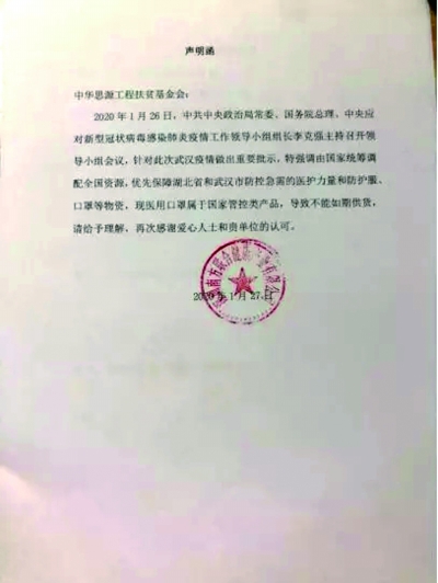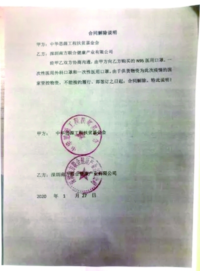 ■ 本報記者 張明敏 1月29日,因沒有達成執(zhí)行意向,湖北省紅十字基金會向中華思源工程扶貧基金會(以下簡稱“思源工程”)退還1900余萬元善款,并在微博發(fā)布付款回單。但隨即有網友指出,該付款回單上,收款人開戶行中的“支行”被誤寫作“之行”,且退還金額少了20萬元。 此外,有網友質疑,思源工程在1月26日通過微博發(fā)布的防控物資采購公告中,所示的供貨方并不具備醫(yī)療口罩生產資質。此外,思源工程2014年至2018年的五年累計捐贈收入比公益支出多出1.83億元,這筆余款的使用也引人關注。 1月31日,《公益時報》記者聯(lián)系思源工程副秘書長陶鳴,對這些質疑進行了回應。 合同公示期 未撥付任何資金 陶鳴在接受《公益時報》記者采訪時表示:“向深圳南方聯(lián)合健康產業(yè)有限公司采購口罩一事屬實,該微博發(fā)布的采購合同尚在公示期,只是意向性購買,并未達成實質性購買,所以僅有思源工程一方蓋章。公示期內并未向對方支付定金或撥付任何款項?!?/p> 對于網友提出供貨商深圳南方聯(lián)合健康產業(yè)有限公司供應資質的問題,思源工程方面給記者傳來了幾張該公司的資質圖片,包括營業(yè)執(zhí)照、醫(yī)療器械經營許可證、二類醫(yī)療器械經營備案憑證等。 有網友稱,曾致電深圳南方聯(lián)合健康產業(yè)有限公司求證向思源工程供貨一事,得到答復為“從未賣口罩給基金會”?!豆鏁r報》記者通過“天眼查”查詢到該公司負責人電話,但撥打后均被掛斷。 根據(jù)天眼查顯示,南方聯(lián)合健康產業(yè)有限公司經營項目為“健康產業(yè)投資(具體項目另行申報);醫(yī)療設備的租賃、上門維護以及技術開發(fā);一類醫(yī)療器械的購銷及其它國內貿易(法律、行政法規(guī)、國務院決定規(guī)定在登記前須經批準的項目除外);興辦實業(yè)(具體項目另行申報);經營進出口業(yè)務。(法律、行政法規(guī)、國務院決定禁止的項目除外,限制的項目須取得許可后方可經營)。許可經營項目是:經營醫(yī)療器械的銷售(按醫(yī)療器械經營企業(yè)許可證的審批項目經營)?!?/p> 國家統(tǒng)籌調配資源 合同已取消 陶鳴表示,思源工程從武漢市衛(wèi)健委獲知需求信息后,1月26日,在詢價、談判期間,一方面要求深圳南方聯(lián)合健康產業(yè)有限公司提供采購協(xié)議(注明型號、數(shù)量、單價、總價)等信息,并在網上公示;另一方面立即派員趕往口罩生產地去核實標準、數(shù)量等事宜,公示期間思源工程并未支付定金或撥付任何款項。 由于思源工程采購的GB19083-2010標準N95口罩需求量大,春節(jié)期間第一時間要供貨,很難聯(lián)系上滿足符合標準和條件的生產廠、供貨商。多方聯(lián)系后,深圳南方聯(lián)合健康產業(yè)有限公司表示可以供應GB19083-2010標準的N95醫(yī)用口罩,價格為14元/個。 陶鳴說,在采購合同的詢價、談判公示階段,有網友對GB19083-2010標準的N95醫(yī)用口罩的價格有意見,為尊重網友意見,思源工程開始向社會各界征集價格更低的GB19083-2010標準N95口罩的相關信息。 1月26日,根據(jù)中央應對新型冠狀病毒感染肺炎疫情工作領導小組會議精神,“調配全國資源,優(yōu)先保障湖北省和武漢市急需的醫(yī)護力量和醫(yī)療物資”,深圳南方聯(lián)合健康產業(yè)有限公司不能如期供貨,便取消了合同。 思源工程向《公益時報》出示了一份落款蓋章為1月27日深圳南方聯(lián)合健康產業(yè)有限公司的聲明函,該函件稱1月26日,國務院會議針對武漢疫情做出重要批示,特強調由國家統(tǒng)籌調配全國資源,現(xiàn)醫(yī)用口罩屬于國家管控類產品,導致不能如期供貨,請給與理解,再次感謝愛心人士和貴單位認可。 思源工程方面隨后又出示了一份與深圳南方聯(lián)合健康產業(yè)有限公司于1月27日簽署合同解除說明。表示甲方向乙方購買的供貨物資為此次疫情的國家管控物資,不能按約履行,即簽訂之日起,合同解除。 陶鳴說:“現(xiàn)根據(jù)中央應對新型冠狀病毒感染肺炎疫情工作領導小組會議精神,‘調配全國資源,優(yōu)先保障湖北省和武漢市急需的醫(yī)護力量和醫(yī)療物資’,深圳南方聯(lián)合健康產業(yè)有限公司不能如期供貨,現(xiàn)合同取消?!?/p> 基金會收到退回的20萬捐款 1月29日,湖北省紅十字基金會公布了一張銀行付款電子回執(zhí)單據(jù)引發(fā)關注。該電子回執(zhí)單將收款人開戶行“中國銀行北京幸福廣州支行”中的“支”行寫為“之”行。此外,該電子回單中公示金額與收款方思源工程對外公示額相差20萬元。 針對湖北省紅十字基金會退回金額與思源工程撥付金額不一致,陶鳴回應總金額是一致的。 陶鳴表示,思源工程方面總共向湖北省紅十字基金會撥付了兩筆款項,一筆為愛心網友通過支付寶公益、騰訊公益、新浪微公益、百度公益等線上平臺捐贈的19076805.26元,另一筆為兩位愛心人士線下捐贈的20萬元,兩筆善款共計19276805.26元。思源工程于1月30日下午分開做了公告。 隨后《公益時報》記者在思源工程的官方微博上,看到了1月30日分別發(fā)布于16:04和16:45的兩張退回接收公告。 捐贈收入結余為定向捐贈跨年使用 與此同時,有網友對2014年至2018年思源工程的收入與支出質疑稱,思源工程五年累積捐贈收入比公益支出多1.83億元。 陶鳴表示,網友稱“基金會五年累