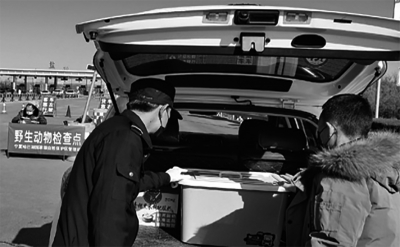 2020年2月2日,在寧夏鹽池縣青銀高速公路花馬池出入口野生動(dòng)物檢查點(diǎn),工作人員檢查即將駛出的車輛