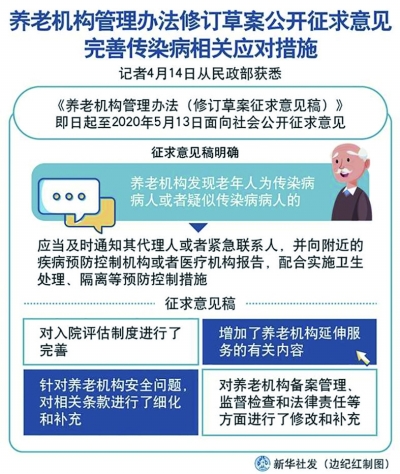 4月14日,民政部對外公布了《養(yǎng)老機構管理辦法(修訂草案征求意見稿)》(以下簡稱《征求意見稿》),并向社會各界征求意見。意見反饋截止時間為2020年5月13日。