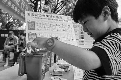 為迎接6月5日世界環(huán)境日,各地舉行多種活動宣傳環(huán)保理念,號召人們愛護自然環(huán)境,呵護美麗家園。圖為6月4日,江蘇省常州市荷花池街道舉行“垃圾分一分,環(huán)境美十分”宣傳活動,一名小朋友在學(xué)習(xí)垃圾分類投放。