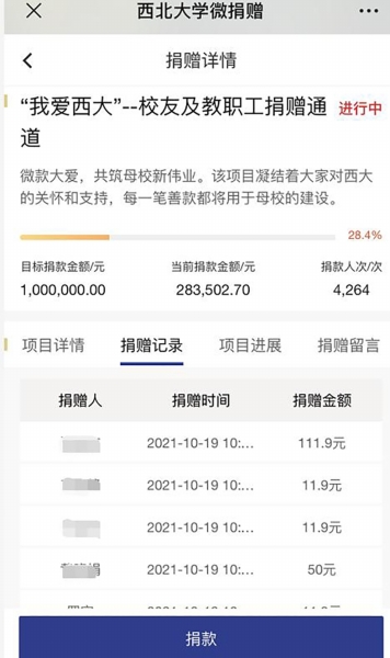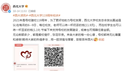 近日,西北大學(xué)官方微博發(fā)出的一則募捐倡議引發(fā)網(wǎng)友熱議。 今年,西北大學(xué)迎來建校119周年。該校校友總會號召校友、老師及學(xué)生,每月捐出一杯奶茶或一杯豆?jié){的錢,支持母校發(fā)展。 倡議發(fā)出后,引來網(wǎng)友調(diào)侃西北大學(xué)是“中國最窮211”。 10月18日,西北大學(xué)工作人員回應(yīng)稱,校友捐贈是大學(xué)經(jīng)費的來源之一,很多大學(xué)都有這種渠道?!拔覀兪窃诜煽蚣芟逻M行的,錢款的使用都會公示。” 募捐“一杯奶茶的錢” 10月14日,西北大學(xué)官方微博發(fā)布一則捐贈倡議。該校校友總會對校友、老師及在校學(xué)生發(fā)出號召:在每月的6~9日將一杯奶茶(11.9元)或一杯豆?jié){(1.19元)的錢節(jié)省下來支持母校發(fā)展建設(shè),或者也可捐贈任意金額,并在文字下方配有捐贈二維碼圖片。 倡議發(fā)出后,引來不少圍觀。對此,有網(wǎng)友表示“大為震驚”,并寫道“不是說缺一杯奶茶錢豆?jié){錢……倡議捐錢是長久之計嗎”。也有人認(rèn)為,“雖然我也捐了,希望學(xué)校也越來越好,但是我覺得這個行為多多少少有點……” 其中也不乏網(wǎng)友調(diào)侃,“捐了,不要讓我沒學(xué)上”“俺們是真的樸”“中國最窮211,心酸,淚目”。 多的留言則是為西北大學(xué)“哭窮”:“在校到畢業(yè),感覺西大一直挺大方。這次雖說是倡議,但這樣伸手,看來真的缺錢了吧,救救西大”“太慘了太慘了……” 撞名美國著名的西北大學(xué),我國西北大學(xué)盡管實力不凡,卻顯得“不太知名”。實際上,擁有119年歷史的西北大學(xué)是我國西北地區(qū)辦學(xué)歷史最為悠久的高等學(xué)府。 官方簡介顯示,西北大學(xué)現(xiàn)為首批國家“世界一流學(xué)科建設(shè)高?!?、國家“211工程”建設(shè)院校、教育部與陜西省共建高校。 在2017年的第四輪學(xué)科評估中,該校有2個學(xué)科進入A類,16個學(xué)科進入前30%,學(xué)科整體實力和水平較第三輪學(xué)科評估有了較大提升。地球科學(xué)、材料科學(xué)、化學(xué)、工程學(xué)、臨床醫(yī)學(xué)、藥理學(xué)與毒理學(xué)等學(xué)科還進入ESI全球前1%行列。 中國“最窮”211? 由校友總會發(fā)起的一項募捐活動也許不代表西北大學(xué)校方試圖以這種方式獲得“大力支持”。但這并不妨礙網(wǎng)友們“借題發(fā)揮”,為西北大學(xué)“實慘”的經(jīng)費現(xiàn)狀而賣力“哭窮”。 當(dāng)前,陜西省共有8所“雙一流”高校,其中3所“一流大學(xué)建設(shè)高?!保次靼步煌ù髮W(xué)、西北工業(yè)大學(xué)、西北農(nóng)林科技大學(xué);5所“一流學(xué)科建設(shè)高校”,即西北大學(xué)、西安電子科技大學(xué)、長安大學(xué)、陜西師范大學(xué)、第四軍醫(yī)大學(xué)。 西北大學(xué)則是8所中唯一一所省屬高校,這成為影響其經(jīng)費來源的重要因素。 同在陜西的教育部直屬高校西交大、工信部直屬高校西工大的2021年經(jīng)費預(yù)算已躋身百億。其他4所陜西部屬“雙一流”——西電、西農(nóng)、長大、陜師大的預(yù)算總經(jīng)費分別為51.78億元、45.55億元、35.71億元、31.87億元。 作為陜西省屬高校,西北大學(xué)的預(yù)算經(jīng)費為14.18億元,和上面幾所高校相去甚遠(yuǎn)。而這一數(shù)字已相較去年增加了5.73億,增長百分比高達67.8%。 在東西部之間、西部區(qū)域省份內(nèi)的高校經(jīng)費差距更加明顯。 2021年,同樣位于西部的四川省10所地方高校預(yù)算收入均超過10億元。再以省屬頭部高校為例,蘇州大學(xué)預(yù)算收入32.84億元,成都大學(xué)為24.3億元。 經(jīng)費捉襟見肘,西北大學(xué)產(chǎn)出卻不低。 據(jù)西北大學(xué)校長郭立宏透露,該校投入產(chǎn)出比位居全國高校前列。西北大學(xué)辦學(xué)經(jīng)費投入位列95所一流學(xué)科建設(shè)高校中下游,高層次人才引育成效和科研產(chǎn)出則分列第8和第24位。 西北大學(xué)官微在一篇題為《西北大學(xué)2020年十大新聞》的文章披露,2020年,該校獲批國家級哲學(xué)社會科學(xué)科研項目41項,其中重大重點項目8項;教育部人文社科項目20項;獲批國家自然科學(xué)基金135項,其中重大重點項目6項,獲批國家重點研發(fā)計劃課題8項;科研到款經(jīng)費3.58億元,其中理工類縱向項目到款2.26億元,創(chuàng)歷史新高。 2021年8月,西北大學(xué)公布2021年度國家自然科學(xué)基金項目申請結(jié)果。在申報的各類項目579項,共有144項項目獲得資助,獲批直接經(jīng)費6944萬元,項目資助率24.87%,超過基金委平均資助率8個百分點。獲批項目數(shù)較上年同期增長9.92%。 高校校友“高額”捐贈 那么,西北大學(xué)校友總會發(fā)出的募捐是否真的顯“寒酸”? 其實,我國其他高校校友會也曾發(fā)出類似的倡議,數(shù)額也并不高。 比如,北京大學(xué)校友會今年7月對該校2021屆畢業(yè)生發(fā)起的倡議以支持北大的一項公益種子計劃,倡議捐贈額從1.23元起、或捐贈123元,可獲得相應(yīng)捐贈紀(jì)念品。 復(fù)旦大學(xué)則會在每年建校周年紀(jì)念日發(fā)起年度捐贈。以2021年為例,復(fù)旦建校116年,該校校友會倡導(dǎo)以116元的倍數(shù)進行(116,232,348……以此類推),所有捐贈將注入復(fù)旦大學(xué)校友基金,以支持復(fù)旦大學(xué)發(f
