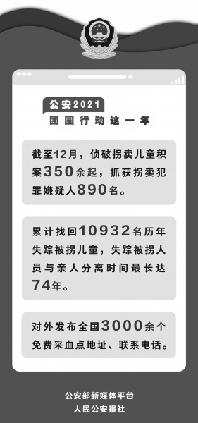 在四川省綿陽市公安局狹長的走廊通道里,王玉菊(化名)夫婦來回踱著步,焦急地等待著DNA比對結(jié)果。 32年里,王玉菊夫婦沒有停止過對雙胞胎女兒的尋找。得知公安機關(guān)正在全國范圍內(nèi)開展‘團圓’行動,他們馬上到當(dāng)?shù)毓矙C關(guān)尋求幫助。 ‘每一個失散親人的家庭,都有一段不堪回首的尋親之苦和骨肉分離的思念之痛,都渴望早日找回親人、全家團圓。為離散家庭消除痛苦、實現(xiàn)團圓是我們公安機關(guān)的重大責(zé)任。’公安部刑事偵查局相關(guān)負責(zé)人說。 2021年,全國公安機關(guān)開展為期一年的‘團圓’行動,全力偵破拐賣兒童積案、全力緝捕拐賣兒童犯罪嫌疑人、全面查找失蹤被拐兒童。截至2021年12月,已找回歷年失蹤被拐兒童10932名。 “看到失散多年的家庭團聚,再苦再累都值得” “沒錯!就是她們!”經(jīng)過反復(fù)的遺傳信息核查和人像比對,最終確認福建汪銀銀(化名)和安徽趙珊(化名)的生物信息與王玉菊夫婦吻合,屬于親子關(guān)系。民警胡祥雨興奮地把檢驗結(jié)果第一時間告訴了王玉菊夫婦。 胡祥雨,來自綿陽市公安局刑偵支隊,主要負責(zé)打拐工作?!皥F圓”行動開展以來,為了讓群眾尋親更加方便,綿陽公安機關(guān)在重點地區(qū)成立了3個以打拐民警名字命名的反拐尋親工作室,“胡祥雨工作室”就是其中之一。以工作室為依托,截至2021年12月13日,胡祥雨和當(dāng)?shù)卮蚬彰窬还矌椭?16個家庭實現(xiàn)了團圓。 汪銀銀和趙珊的信息雖然比對成功了,但還有一件事像一塊石頭一樣壓在胡祥雨心里?!罢业胶⒆又皇菑?fù)雜工作的第一步。”胡祥雨說。 原來,由于事發(fā)突然,汪銀銀和趙珊沒有思想準備,對認親抱有一些抵觸情緒。 胡祥雨反復(fù)通過短信、電話、微信聯(lián)系,并專程跑到福建、安徽,與汪銀銀和趙珊不斷溝通,解釋情況,終于獲得了她們的理解和信任。2021年10月30日,在綿陽公安的見證下,失散32年的王玉菊一家重獲團圓。 “感謝你們的辛苦付出,你們真是人民英雄!”王玉菊抱著兩個女兒,激動地對胡祥雨等民警表示感謝。 安徽省公安廳刑警總隊“打拐辦”負責(zé)人楊菁表示,“雖然大家長期超負荷工作,但每當(dāng)看到失散多年的家庭團聚,再苦再累都值得!” “每位民警都承擔(dān)數(shù)項任務(wù),嚴格意義上的專職打拐民警沒有幾個人。大家的任務(wù)特別重,可就是在這種情況下,我們的民警依然奮戰(zhàn)在打拐工作第一線,為的就是努力讓更多家庭實現(xiàn)團圓?!睏钶冀榻B,很多民警發(fā)現(xiàn)了線索就住在當(dāng)?shù)兀槐楸榈夭杉畔?、血樣,反?fù)走訪摸排,如同是在找尋自己的親人。 “公安機關(guān)更加有能力、有條件承擔(dān)起這份重任” “團圓”行動中,找到的失蹤被拐人員與親人分離時間最長達74年。 “受限于技術(shù)條件等原因,以前很多失蹤被拐兒童案件沒有得到及時偵破。隨著DNA技術(shù)和人像比對技術(shù)不斷發(fā)展、公安辦案能力持續(xù)提升、打拐工作機制不斷完善,尤其是公安部部署開展命案積案攻堅行動以來,各地公安機關(guān)在組織指揮、技術(shù)支撐、區(qū)域協(xié)作等方面積累了豐富經(jīng)驗?!惫膊啃虃删指本珠L童碧山介紹。 人民群眾期盼的,人民警察一直沒有放棄?!艾F(xiàn)在,公安機關(guān)更加有能力、有條件主動承擔(dān)起這份重任?!蓖躺秸f。 “我覺得差不多了,肯定是這個!”參加“團圓”行動刑事技術(shù)集中比對會戰(zhàn)的民警李海燕很自信。 2021年5月的一天,天津市公安局刑偵總隊刑事技術(shù)專家呂游正拿著一張被拐男孩祁吉5歲時的照片在電腦屏幕前仔細做著對比,突然發(fā)現(xiàn)一名廣東省汕頭市的男子和祁吉的五官特征高度相似,馬上請李海燕幫忙聯(lián)系地方公安機關(guān)核查。 “通過對祁吉小時候的照片進行技術(shù)增強和清晰化處理,我們得到了200多個高度相似的照片,經(jīng)過兩天不斷甄別篩選,最終找到一個生物特征最符合的男孩,反復(fù)比對分析后,最終確認這個男孩就是祁澤華、龍大娥夫婦失散25年的兒子?!眳斡握f。 “人像比對技術(shù)之前不成熟,準確率低,沒有大范圍應(yīng)用在打拐領(lǐng)域,這幾年通過不斷迭代發(fā)展,人像比對技術(shù)準確率有了大幅提升?!?021年9月,呂游再次參加公安部組織的第二次技術(shù)比對會戰(zhàn),每天依舊工作近10個小時,查看上千張照片,但他覺得很有成就感,“我們甚至還比中過一張被拐兒童的百日照”。 同樣參加過技術(shù)比對會戰(zhàn)的公安部物證中心情報處處長劉冰介紹,將DNA技術(shù)與人像比對技術(shù)成功融合,是這次“團圓”行動最大的技術(shù)嘗試和突破,得到了“1+1>2”的效果。 據(jù)介紹,目前,我國DNA檢測技術(shù)和數(shù)據(jù)信息庫建設(shè)處于世界一流水平,檢驗方法穩(wěn)定可靠,識別準確率越來越高,為找到失蹤被拐兒童提供了強有力的支撐,成為這次“團圓”行動取得豐碩戰(zhàn)果的重要原因之一。 “繼續(xù)加大宣傳力度,幫助更多的離散家庭團聚” “團圓行動,免費采集DNA”“圓夢有路 助愛回家”“你和你的親人只差一滴血的距離”,在失蹤被拐兒童案件發(fā)生的重點地區(qū),經(jīng)常能看見印有這些宣傳標語的海報。 DNA檢測是最終認定失散家庭是否屬于親子關(guān)系的唯