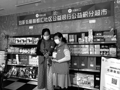 2022年4月16日,志愿者在漢陽區(qū)四新街道梅林都匯社區(qū)“公益積分超市”兌換生活用品,社工則在“公益銀行微信小程序”上掃碼核銷