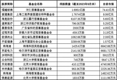 中科創(chuàng)達(dá)3月13日晚披露,公司控股股東趙鴻飛擬向北京理工大學(xué)教育基金會(huì)(以下簡(jiǎn)稱“北理工教育基金會(huì)”)捐贈(zèng)其間接持有的公司16.9萬(wàn)股股份。以中科創(chuàng)達(dá)當(dāng)前股價(jià)估算,上述捐贈(zèng)的股份市值約1041.38萬(wàn)元。如此大手筆的捐贈(zèng)也引發(fā)了市場(chǎng)熱議。 作為在民政部正式登記注冊(cè)的慈善組織,北理工教育基金會(huì)承諾其受贈(zèng)資金都將用于北京理工大學(xué)的教育發(fā)展及社會(huì)公益事業(yè)。 記者根據(jù)A股上市公司過(guò)往定期報(bào)告梳理發(fā)現(xiàn),目前有十幾家基金會(huì)活躍其中。截至目前,這些基金會(huì)合計(jì)持股市值已超百億元,其持股主要來(lái)自于上市公司股東捐贈(zèng)。 截至2023年9月30日,河仁慈善基金會(huì)持有福耀玻璃股票1.7億股;截至今年3月13日收盤,上述股份市值高達(dá)74.41億元。 河仁基金會(huì)由企業(yè)家、福耀玻璃董事長(zhǎng)曹德旺捐資創(chuàng)立,是全國(guó)第一也是唯一經(jīng)由國(guó)務(wù)院審批、以金融資產(chǎn)(股票)創(chuàng)辦的全國(guó)性非公募基金會(huì)。基金會(huì)的名稱,來(lái)自曹德旺的父親曹河仁,名稱中蘊(yùn)藏“上善若水,厚德載物”之意。 2011年5月,在河仁基金會(huì)成立大會(huì)上,曹德旺與其妻子陳鳳英宣布向基金會(huì)捐贈(zèng)個(gè)人所持福耀玻璃3億股股票。上述股票過(guò)戶當(dāng)日市值為35.49億元。 2012年度,河仁基金會(huì)減持福耀玻璃股票1000萬(wàn)股,期末持股2.9億股。在此后的多年時(shí)間里,河仁基金會(huì)所持福耀玻璃股票一直未發(fā)生變化。2020年度,河仁基金會(huì)減持福耀玻璃股票6891.09萬(wàn)股,期末持股2.21億股。2021年、2022年河仁基金會(huì)分別減持3180.02萬(wàn)股、1977.6萬(wàn)股,持股降至1.7億股。 曹德旺一直熱衷慈善。據(jù)公開信息,從1983年第一次捐款至今,曹德旺累計(jì)個(gè)人捐款達(dá)160億元。 持股市值排名第二的慈善基金會(huì)為上海工商界愛國(guó)建設(shè)特種基金會(huì)(以下簡(jiǎn)稱“愛建基金會(huì)”)。愛建基金會(huì)持有愛建集團(tuán)股票1.77億股,市值約8.06億元。 據(jù)愛建基金會(huì)網(wǎng)站介紹,其前身是上海工商界愛國(guó)建設(shè)特種基金(以下簡(jiǎn)稱“愛建特種基金會(huì)”)。上世紀(jì)80年代末至90年代初,愛建集團(tuán)前身愛國(guó)建設(shè)醞釀股份制改革,把歷年積累的4500萬(wàn)元捐贈(zèng)出來(lái),設(shè)立了愛國(guó)建設(shè)特種基金。1992年9月,愛國(guó)建設(shè)改制為股份公司,愛建特種基金會(huì)成為發(fā)起人股東。2005年4月,愛建特種基金會(huì)更名為愛建基金會(huì)。 愛建集團(tuán)上市后,愛建基金會(huì)長(zhǎng)期為公司控股股東。2012年6月,愛建集團(tuán)完成非公開發(fā)行,愛建基金會(huì)持股比例遭稀釋。上市公司在2012年年報(bào)中稱自己無(wú)控股股東。 2018年6月,愛建集團(tuán)非公開發(fā)行股票完成及董事會(huì)調(diào)整后,均瑤集團(tuán)成為上市公司控股股東。愛建基金會(huì)退居次席,為公司第二大股東。 持股市值排名第三的為浙江嘉行慈善基金會(huì)(以下簡(jiǎn)稱“嘉行基金會(huì)”)。截至去年9月末,嘉行基金會(huì)持有海亮股份股票6107.35萬(wàn)股。這筆股權(quán)目前市值約5.65億元。 嘉行基金會(huì)成立于2007年8月。其網(wǎng)站稱,基金規(guī)模為11.86億元,全部來(lái)源于海亮集團(tuán)(海亮股份控股股東)及創(chuàng)始人馮海良和公司其他股東捐贈(zèng)。截至2023年年底,嘉行基金會(huì)累計(jì)捐贈(zèng)總額超過(guò)21.47億元。 截至去年9月末,浙江存濟(jì)醫(yī)療教育基金會(huì)(以下簡(jiǎn)稱“存濟(jì)基金會(huì)”)持有通策醫(yī)療股票796.08萬(wàn)股。這筆股權(quán)目前市值5.25億元。 據(jù)相關(guān)報(bào)道,2015年7月,通策醫(yī)療牽頭發(fā)起成立存濟(jì)基金會(huì)。公司實(shí)際控制人呂建明曾表示,其希望基金會(huì)在未來(lái)能夠?yàn)橹袊?guó)現(xiàn)代醫(yī)學(xué)的長(zhǎng)期發(fā)展奠定系統(tǒng)的、堅(jiān)實(shí)的、高水平的基礎(chǔ),推動(dòng)醫(yī)學(xué)基礎(chǔ)研究,引進(jìn)世界先進(jìn)醫(yī)療技術(shù),提高醫(yī)療教育水平等。 2019年12月,通策醫(yī)療披露,其股東鮑正梁向存濟(jì)基金會(huì)捐贈(zèng)961.92萬(wàn)股公司股票,用于符合基金會(huì)資助標(biāo)準(zhǔn)的醫(yī)療教育項(xiàng)目。 自2022年第四季度起,存濟(jì)基金會(huì)陸續(xù)減持了所持通策醫(yī)療部分股票。至2023年6月末,存濟(jì)基金會(huì)持股降至796.08萬(wàn)股。 美的集團(tuán)創(chuàng)始人何享健發(fā)起設(shè)立的廣東省和的慈善基金會(huì)(以下簡(jiǎn)稱“和的基金會(huì)”)持有賽意信息股票2000萬(wàn)股。截至目前,和的基金會(huì)上述持股市值約4.05億元,排名第五。截至2022年12月,和的基金會(huì)對(duì)外資助金額近22億元,主要用于資助醫(yī)養(yǎng)健康、文化藝術(shù)、社區(qū)發(fā)展等項(xiàng)目。 一些基金會(huì)獲贈(zèng)的大額股份尚未完成過(guò)戶。 概倫電子2023年7月曾披露,為支持母校華南理工大學(xué)的教育事業(yè)的發(fā)展,促進(jìn)學(xué)校集成電路學(xué)科的建設(shè)與發(fā)展,公司董事長(