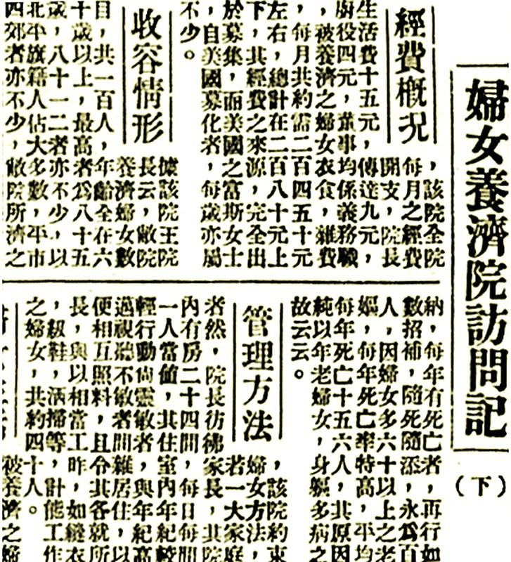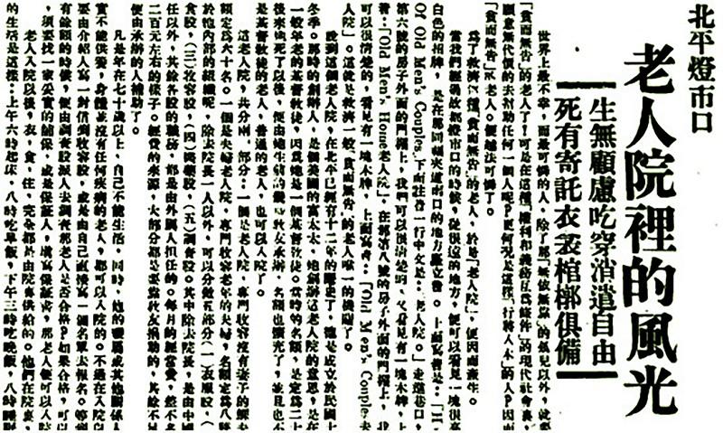 20世紀30年代,由于養(yǎng)老金和退休制度尚未普遍建立、戰(zhàn)爭及災害頻繁,北平市老年貧民的流離失所、孤苦無依逐漸成為一個社會問題。如果說以往對于老年貧民的社會救濟帶著濃厚的“施惠”“憐民”色彩,那么20世紀30年代的養(yǎng)老救濟則開始具備一定的政府責任意識。北平市社會局救濟院與民間力量發(fā)起的各種養(yǎng)老院所相輔相成,成為由傳統(tǒng)社會向現(xiàn)代福利社會轉(zhuǎn)型過程中社會養(yǎng)老救濟實踐不可或缺的參與主體。盡管由于受到社會歷史條件的局限,這一時期的養(yǎng)老救濟事業(yè)還存在著種種缺陷,但其對維持社會秩序、保障戰(zhàn)亂時的民生還是有一定的促進作用。 官辦救濟院成立殘老組 與此前主要以民間力量興辦的善堂善會為主的救濟設(shè)施構(gòu)成相比,這一時期由北平市政府主導的救濟設(shè)施有所增多,同時面向孤寡老人和殘疾人等社會弱勢群體的救濟設(shè)施也開始趨于制度化。 一、殘老組及其養(yǎng)老設(shè)施 1934年6月1日,經(jīng)北平市政府批準,由原第一救濟院、第二救濟院、婦女救濟院、第一習藝工廠、第二習藝工廠、乞丐收容所等處改組成立北平市社會局救濟院,院址設(shè)于宣外教子胡同前第一救濟院舊址,由龔齊振任院長。其下設(shè)工務股、事務股、營業(yè)股,統(tǒng)一管理北京社會救助事務,成為北平市政府救濟機關(guān)正式建立的標志。1934年8月頒布的《北平市社會局救濟院章程》規(guī)定了救濟院救濟對象,即市內(nèi)貧苦殘老及無依之男女兒童暨不愿為娼之妓女與被虐待之婦孺等。同時,救濟院將前乞丐收容所改為殘老組和感化組,“以原來之第一救濟院改為北平市社會局救濟總所,附設(shè)收容部,收容部下之感化、殘老兩組,仍設(shè)燕翅樓乞丐收容所原址”,提出“其殘老者養(yǎng)之”,從而與其他救濟機構(gòu)得以區(qū)分開來,管理開始趨于規(guī)范。 殘老組收養(yǎng)的老人,或無子女家人,或身體孱弱。為充實、方便老年人的生活,救濟院內(nèi)設(shè)教室、工作室、游戲場、寢室、食堂、浴室等生活設(shè)施。衣物上,收容老人衣著以蔽體、保暖、整潔為主。凡收容者,每年發(fā)給單、棉衣各一套,棉鞋、棉被各一雙(套),棉襪一雙;食物層面,則以能適合老年人咀嚼、果腹的清潔食物為主,并注意個別的營養(yǎng)。早餐有小米粥,午、晚兩餐為玉米面窩頭,佐以菜湯、咸菜。每周一、三、五早餐為白面饅頭,逢年節(jié)增肉食一餐?;疾≌呖梢源竺?、白面調(diào)攝。與此同時,除了涵蓋衣和食的“養(yǎng)”,“醫(yī)”也是老年救濟必不可少的要素。救濟院設(shè)有養(yǎng)病室,“每春夏兩季,為全體收容人員預防白喉、猩紅熱、霍亂等病注射,其有患重病及傳染者,分別送入市立、中央、協(xié)和、傳染等醫(yī)院免費診治”。此外,《北平市社會局救濟院章程》第二十一條規(guī)定,收容人死亡,由院通知其家屬備棺承領(lǐng);其無家屬者,由院棺殮抬埋?!半S時電知第一股,然后由該股函請地方法院檢察處派員檢驗,發(fā)給執(zhí)照,購備棺木,飭役掩埋于本院墓地,樹立石碣”。 二、收養(yǎng)程序 查閱北京市檔案館現(xiàn)存資料可以發(fā)現(xiàn),孤苦無依的老年人經(jīng)由“社會局票交收容”“各區(qū)屬函送”“慈善團體介紹”“自投請求救濟”“家屬送請教養(yǎng)”五種渠道才可以進入社會局救濟院。在救濟收容程序上已具備了現(xiàn)代養(yǎng)老機構(gòu)的特征和功能。 從北京市檔案館查閱的老年救濟申請書及批復的公函件材料來看,1938年1月至12月期間,被收容的老人主要以女性為主,年齡分布最低者是50歲,最長者為80歲?!白酝墩埱缶葷闭哂烧埻墩咦孕刑顚懮暾垥暾垉?nèi)容與實際情況相符并由社會局派出巡官核驗合格后才能入救濟院。例如,巡官楊永志奉派調(diào)查崔董氏呈請赴救濟院收養(yǎng)一案,“遵即赴西城成方街西口外百子胡同五號系崔董氏之內(nèi)侄董乃溫之家寄居,調(diào)查該氏確系年老貧寒無力生活,情愿入院以求生活舖(鋪)保,亦核對相符理合呈報”?!案鲄^(qū)屬函送”則由警察局發(fā)送公函致社會局轉(zhuǎn)交救濟院,“內(nèi)一區(qū)警察署函送關(guān)(關(guān))田氏年老無依請安置一案到局,訉據(jù)該氏供稱孤身一人,僅有外孫女婿英姓住抽屜胡同曾供給伊生活?,F(xiàn)其停止供給無所依附,請安置?!逼渌樾卧诖瞬辉儋樖觥?br> 三、“教養(yǎng)并施,老有所安”的管理方式 一方面,“救人救徹”這一救助理念開始在政府行動中得到一定貫徹而非局限于以往單純發(fā)放衣物、貸款及開設(shè)粥廠和暖廠等此類臨時性的救助行動。如提出“救濟殘老,并不在提供衣食,使有所終,就算盡了最大的義務,乃是如何使‘殘而不廢’‘老有所安’”等等。 另一方面則是由過去的“重養(yǎng)輕教”逐漸轉(zhuǎn)向“教養(yǎng)并施”。救濟院一般向老年人提供有益身心健康的課程,并根據(jù)體質(zhì)情況設(shè)立操作室,實施技能調(diào)練,盡其所能予以生產(chǎn)操作,所得收益用以補助經(jīng)費和改善老人生活;與此同時,注重“因材施教”及“因人施助”;年老人員也不用接受文化教育,僅要求每日接受管理人員訓話,給予一定精神慰藉。對于因種種原因未能“懸鏡婚配”成功的婦女,令其學習一門技藝以便謀