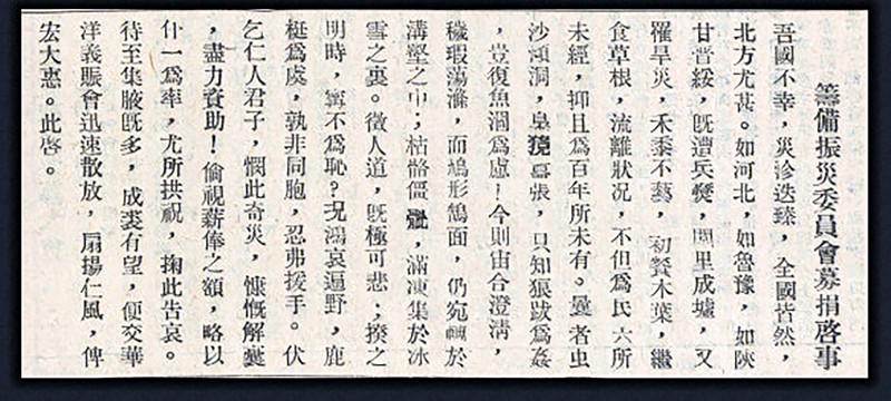 大學(xué)作為培育文明、教書育人的平臺(tái),是傳播與踐行慈善文化的重要基地。仔細(xì)追溯清華大學(xué)的歷史就會(huì)發(fā)現(xiàn),清華人早在建校初期就逐步形成公益慈善傳統(tǒng),并與清華精神的培育與完善相輔相成。有明確資料證明,在1937年之前的早期清華歷史上曾進(jìn)行過多次公益募捐活動(dòng),研討這些清華慈善實(shí)踐的史實(shí),感悟蘊(yùn)含其中的思想精華,對(duì)于清華大學(xué)的發(fā)展,仍然具有十分重要的現(xiàn)實(shí)意義。 早期清華所處的社會(huì)環(huán)境極其復(fù)雜,可以說,是在近代中國(guó)社會(huì)矛盾重重,外憂內(nèi)患頻頻的艱難時(shí)代中 “搞教育,做學(xué)問”,蹣跚前行,步步驚心。在不斷發(fā)生的天災(zāi)人禍面前,清華人一方面以堅(jiān)持大學(xué)教育的發(fā)展為己任,一方面也以各種形式為“賑災(zāi)扶貧,抗敵勞軍”竭盡“匹夫報(bào)國(guó)”的盡心之力。這些慈善行動(dòng)為百年清華的歷史留下了深刻的印記和寶貴的精神財(cái)富。 1928年組織旱災(zāi)捐助 根據(jù)史料記載,從1928年開始,中國(guó)北方發(fā)生過一場(chǎng)持續(xù)三年的罕見大災(zāi)荒。這場(chǎng)以旱為主,蝗、風(fēng)雪、雹、水、疫并發(fā)的巨災(zāi),以陜西、甘肅為中心,遍及山西、綏遠(yuǎn)、河北、察哈爾、熱河、河南等八省,并波及山東、蘇北、皖北、湖北、湖南、四川、廣西的一部或大部,形成了一個(gè)面積廣袤的災(zāi)區(qū)。這場(chǎng)災(zāi)荒史稱“民國(guó)十八年年饉”,并被歷史學(xué)家列為“中國(guó)近代十大災(zāi)荒”之一。 在災(zāi)情被媒體持續(xù)曝光之后,清華師生也被這場(chǎng)災(zāi)難的嚴(yán)重程度所震驚,并迅速采取募捐賑災(zāi)行動(dòng)。1928年12月20日,剛剛正式成立不久的國(guó)立清華大學(xué)設(shè)立“籌備賑災(zāi)委員會(huì)”,委員會(huì)由清華秘書長(zhǎng)馮芝生、教務(wù)長(zhǎng)楊金甫、外文系主任王立山教授、庶務(wù)科主任張仲魯、體育館主任馬約翰、學(xué)生評(píng)議部主席高琦、干事部主席張企泰以及學(xué)生代表李健吾、蘇宗固、容啟東、朱麗琛共11人組成,馮芝生任主席。時(shí)任校長(zhǎng)羅家倫(1897—1969)參加了賑災(zāi)委員會(huì)第一次會(huì)議。會(huì)議對(duì)有關(guān)賑災(zāi)事宜進(jìn)行決議,希望教職員捐出每月薪金的十分之一。羅家倫校長(zhǎng)和王立山主任當(dāng)場(chǎng)允諾捐出月薪金的十分之二,以為表率。 賑災(zāi)委員會(huì)于12月26日在《國(guó)立清華大學(xué)??返谝淮蔚禽d了募捐啟事,其中寫道:“吾國(guó)不幸,災(zāi)診迭臻,全國(guó)皆然,北方尤甚?!醪湍救~,繼食草根,流離狀況,不但為民六所未經(jīng),抑且為百年所未有……征人道,既極可悲;揆之明時(shí),寧不為恥?況哀鴻遍野,鹿梃為虞,孰非同胞,忍弗援手。伏乞仁人君子,憫此奇災(zāi),慷慨解囊,盡力資助!倘視薪俸之額,略以什一為率,尤所拱祝。掬此告哀。待至集腋既多,成裘有望,便交華洋義賑會(huì)迅速散放,扇揚(yáng)仁風(fēng),俾宏大惠。”情真意切,躍然紙上! 在發(fā)出賑災(zāi)募捐啟事之后,賑災(zāi)委員會(huì)又于12月28日、31日連續(xù)在??系禽d有關(guān)災(zāi)情的報(bào)道和募捐辦法,同時(shí)在12月29日晚間在大禮堂組織了一場(chǎng)“賑災(zāi)游藝大會(huì)”,清華銅管樂隊(duì)參演,并請(qǐng)來一些當(dāng)時(shí)著名的昆曲名家、魔術(shù)師、演奏家獻(xiàn)藝。所得門票價(jià)款悉數(shù)轉(zhuǎn)為賑災(zāi)款。這種募捐形式也可以看作是發(fā)展至今的各類“賑災(zāi)義演”的雛形。 在這次巨大災(zāi)情中,中國(guó)華洋義賑會(huì)、中國(guó)紅十字會(huì)、世界紅卍字會(huì)、中國(guó)濟(jì)生會(huì)等社會(huì)救助團(tuán)體在賑災(zāi)工作中扮演著重要角色,發(fā)揮了舉足輕重的作用。這些社會(huì)救助團(tuán)體主要通過募集與發(fā)放賑款、衣物,開辦粥廠,開設(shè)災(zāi)民收容所,發(fā)放貸款、種子等措施開展救濟(jì)工作。當(dāng)年清華的賑災(zāi)善款主要是通過華洋義賑會(huì)轉(zhuǎn)賑。經(jīng)過三個(gè)月的募捐,清華全校師生員工募集的善款超過2000元。 1929年4月1日,??禽d中國(guó)華洋義賑救災(zāi)總會(huì)來函,告知收到清華全校師生員工募集的2225.58元善款,并已“歸入急賑專款項(xiàng)下購(gòu)糧匯放”。在大規(guī)模募捐之后,在??先钥梢园l(fā)現(xiàn)有師生陸續(xù)捐款的報(bào)道,如外國(guó)語文系教授翟孟生一次捐款30大洋,舊大一學(xué)生捐款22元等。 1931年組織水災(zāi)捐助 在中國(guó)近代史上,1931年發(fā)生過一次迄今為止最嚴(yán)重的水災(zāi)。據(jù)史料稱,這一年中國(guó)氣候反常,大面積降雨。從5月下旬開始,長(zhǎng)江、黃河、淮河、松花江、遼河、鴨綠江流域都持續(xù)降雨,時(shí)間竟長(zhǎng)達(dá)三個(gè)月之久。水災(zāi)區(qū)域南到珠江流域,北至長(zhǎng)城關(guān)外,東起江蘇北部,西至四川盆地,范圍之廣前所未有,造成的災(zāi)民數(shù)量起碼達(dá)到1億人,死亡人數(shù)約400萬,經(jīng)濟(jì)損失不計(jì)其數(shù)。饑餓、寒冷、傳染病的肆意侵襲,更多的人死于洪災(zāi)之后的饑荒與疾病,可謂“生靈涂炭、滿目瘡痍”。由此,這次災(zāi)害被列為世界十